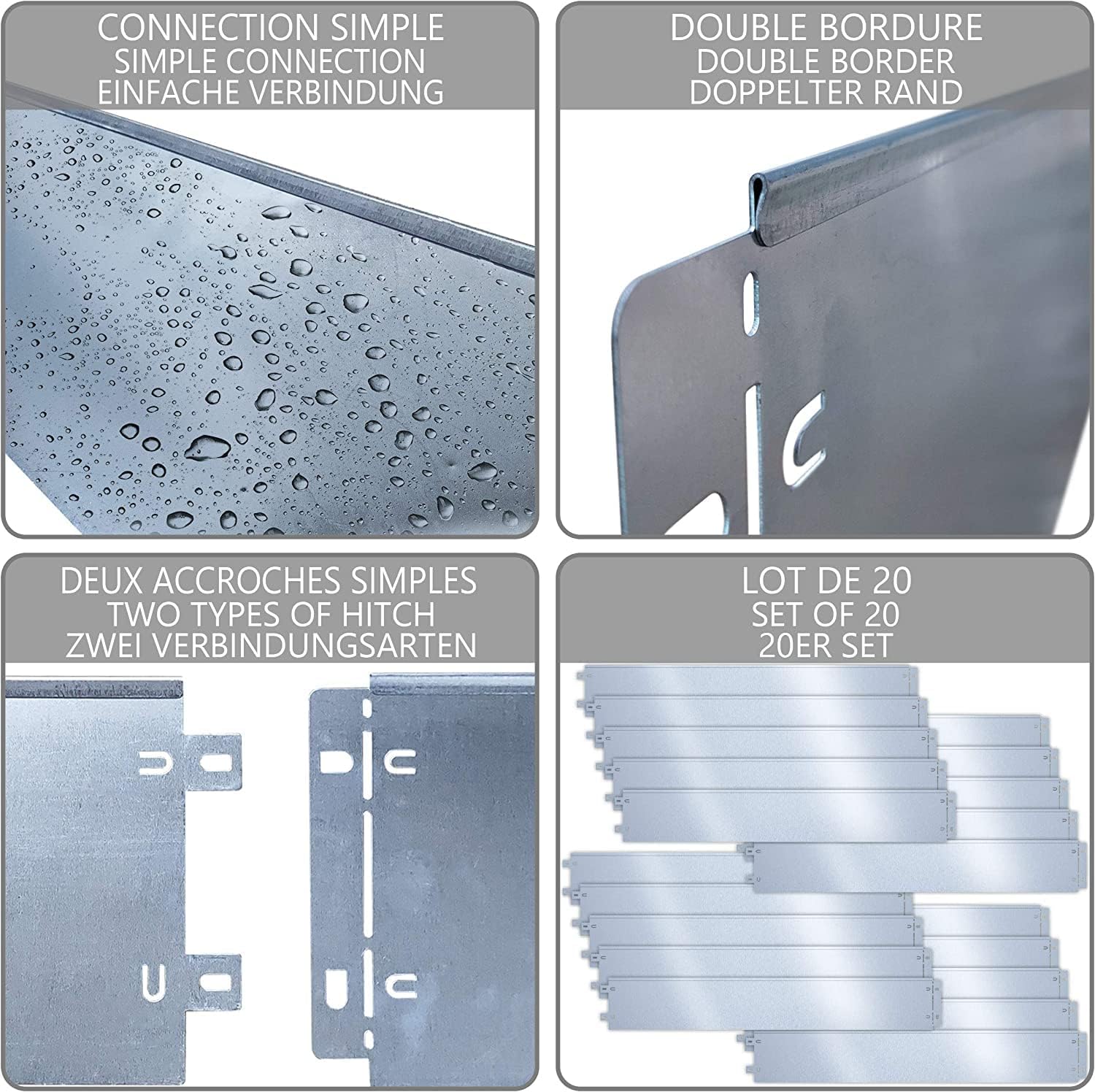 - EIGENSCHAFTEN: Die Lieferung umfasst 20 Rasenkanten. Grösse jedes Randes: 18 x 100 cm. Dicke: 0,7 mm. Material: Verzinkter Stahl.