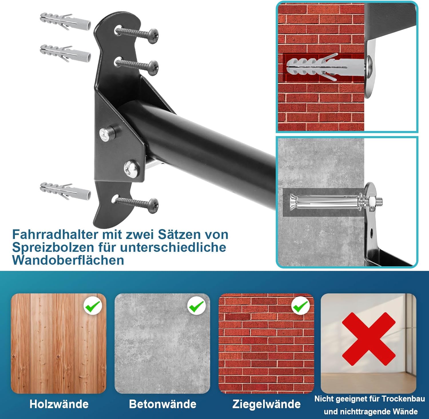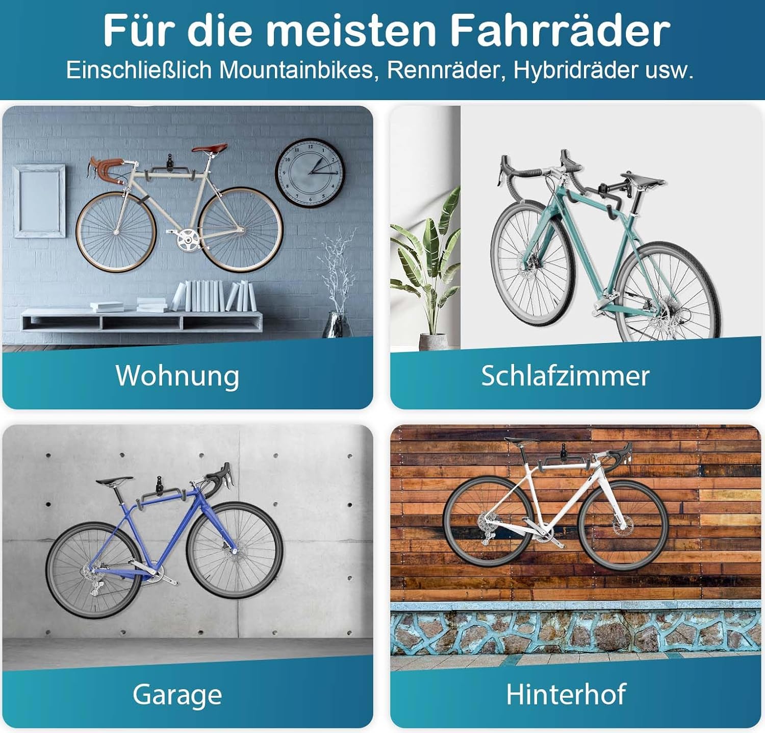 - Kompatibilität mit den meisten Fahrrädern: Die Fahrradwandhalterung ist für verschiedene Fahrradtypen geeignet, darunter Rennräder und Hybridräder.