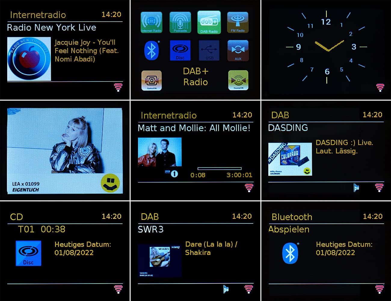 - Jeweils 40 Senderspeicher für Internetradio, DAB+ und UKW (FM) • Bluetooth 5 für kabellose Musik-Wiedergabe von Smartphone und Bluetooth-fähigen Audiogeräten, unterstützte Profile: HFP, A2DP und AVRCP • Grosses LCD-Farbdisplay mit 8,1 cm /