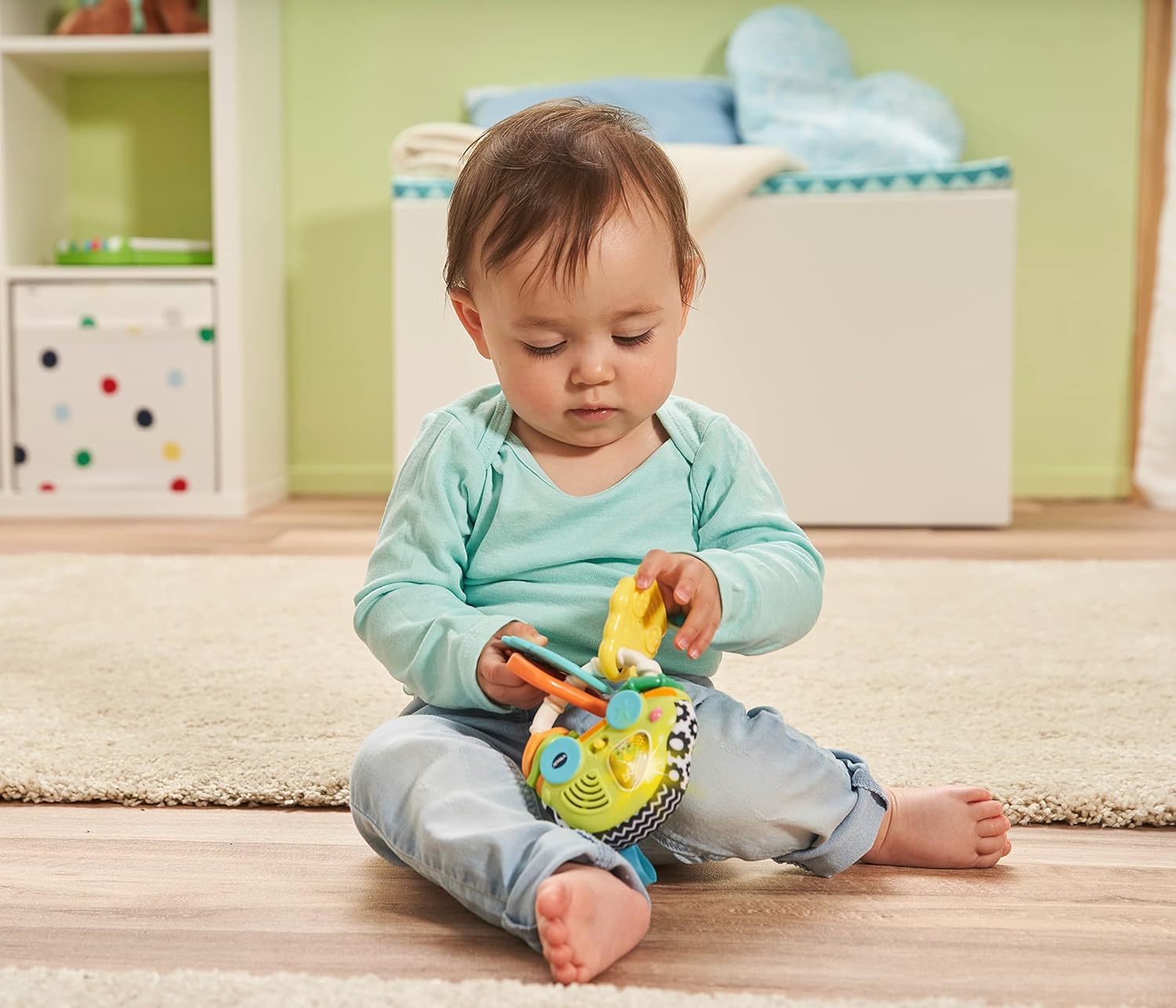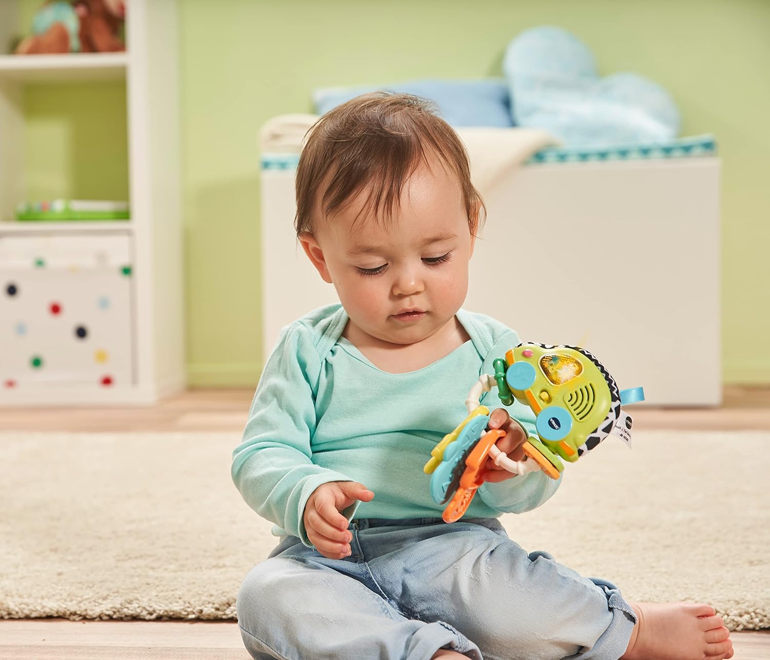 - Der Schlüsselbund hilft beim Zahnen, schult die visuelle Wahrnehmung, Feinmotorik und den Tastsinn und lässt erste Wörter und Farben entdecken / Dank der Abschaltautomatik werden Batterien gespart