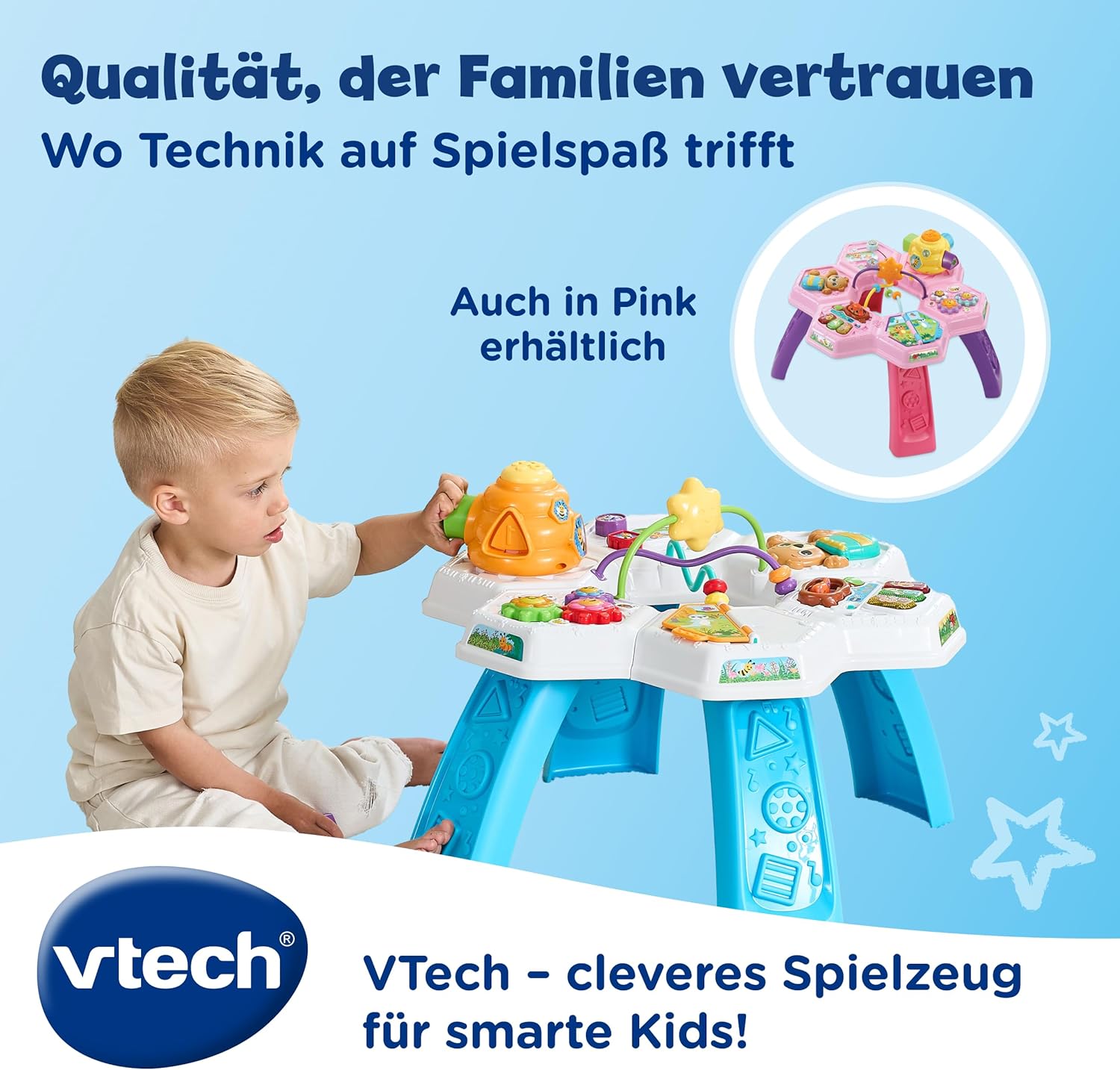 - Lieferumfang: VTech Baby - Babys Entdeckertisch / Deutsche Version / Alter: 12-36 Monate / Kindersicheres Batteriefach, Lautstärkeregler und Abschaltautomatik / 2 x AA Demobatterien / Art. Nr.: 80-579004