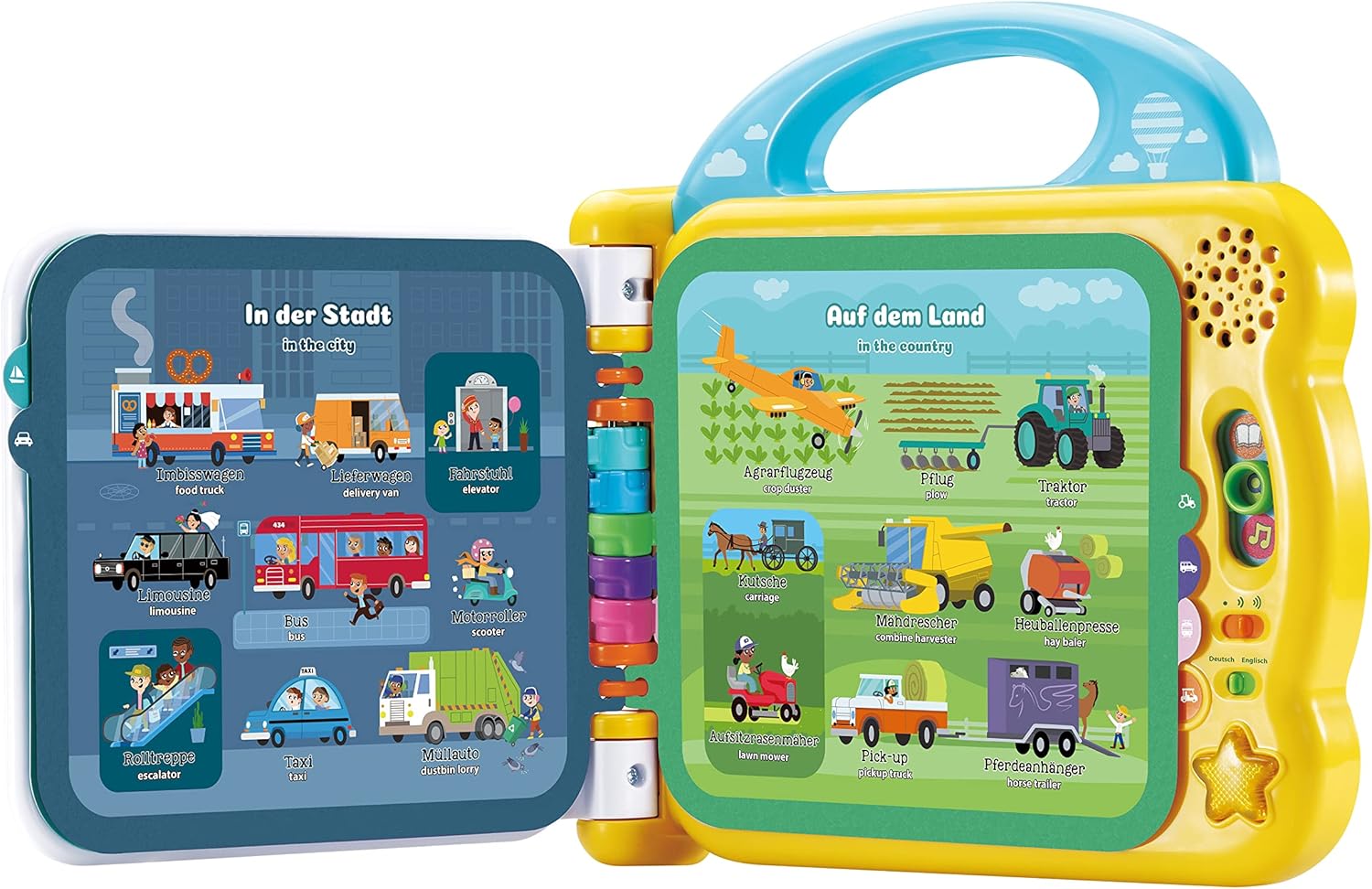 - Lernspass auf 12 Seiten: Tippt das Kind auf die einzelnen Bilder einer Seite, lernt es kreativ über 100 englische und deutsche Wörter - mit dem Sprachschalter kann die Sprache eingestellt werden
