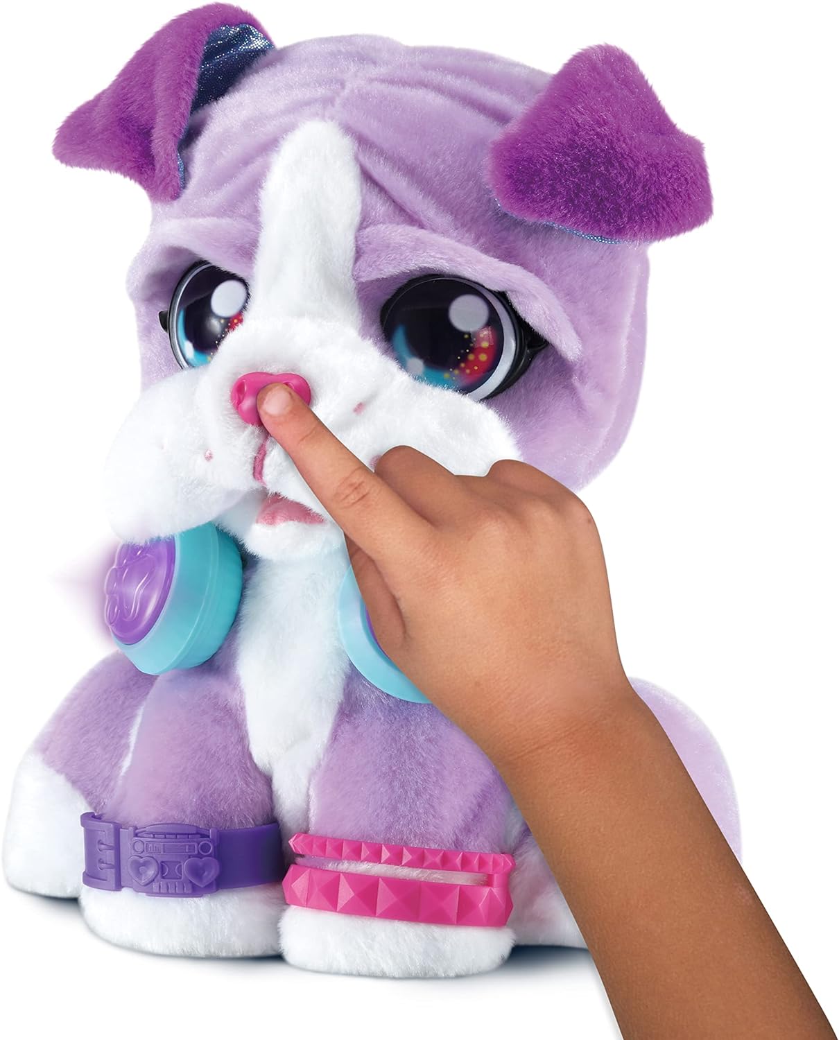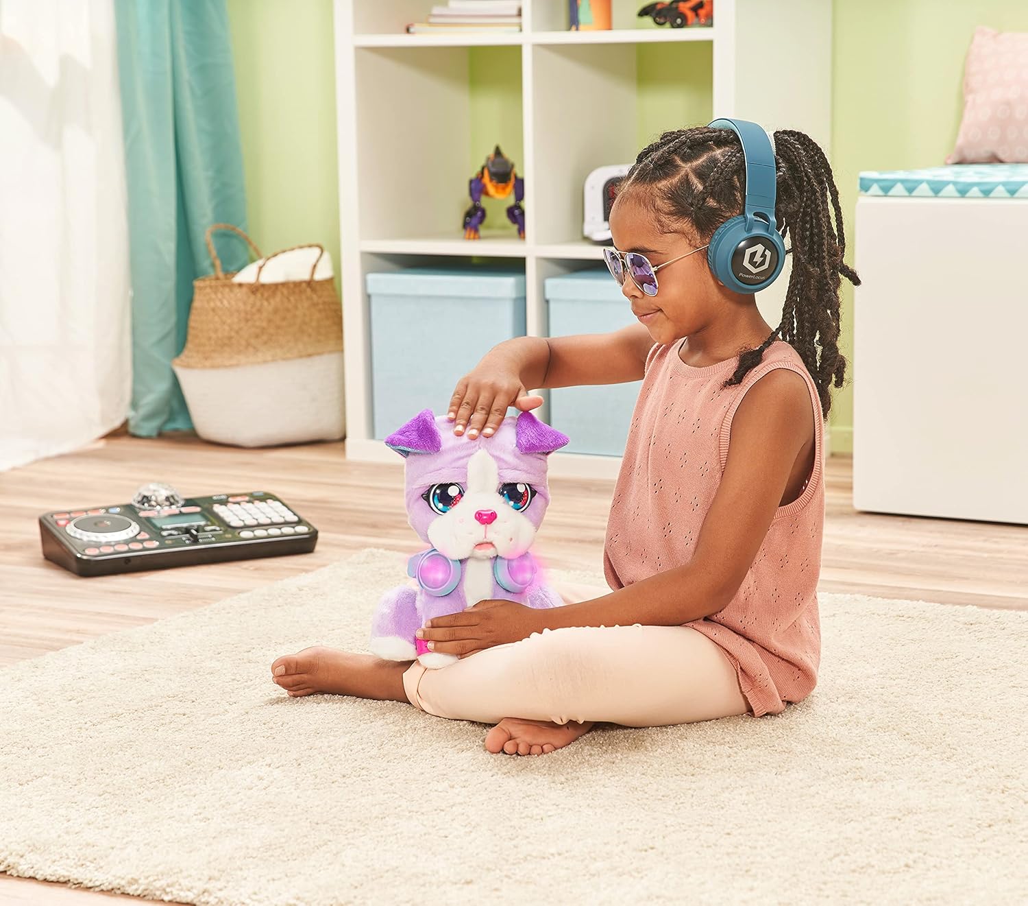 - Der niedliche Boxer-Welpe mit flauschigem Fell, coolen Accessoires und leuchtenden Kopfhörern reagiert auf Berührungen an der Nase, dem Kopf, dem Ohr und der linken Pfote sowie dem Kopfhörer