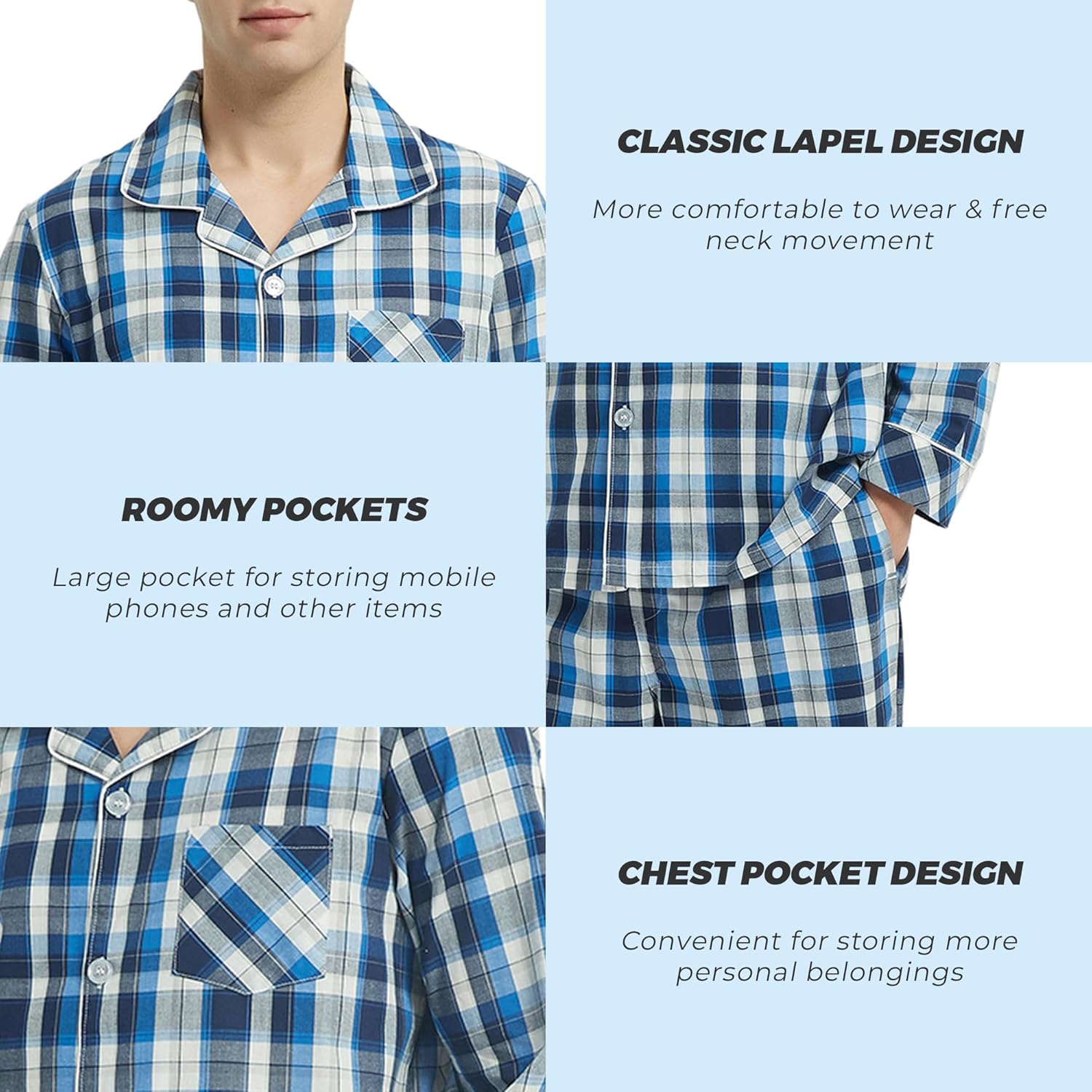 - 【Klassisches Design】Der leichte Herren Pyjama Baumwolle mit klassischem Revers und kariertem Design. Unser langer Schlafanzug Herren hat eine Knopfleiste und einen gekerbten Kragen mit Brusttasche. Der gewebte Prozess verleiht dem Herren Schlafanzug