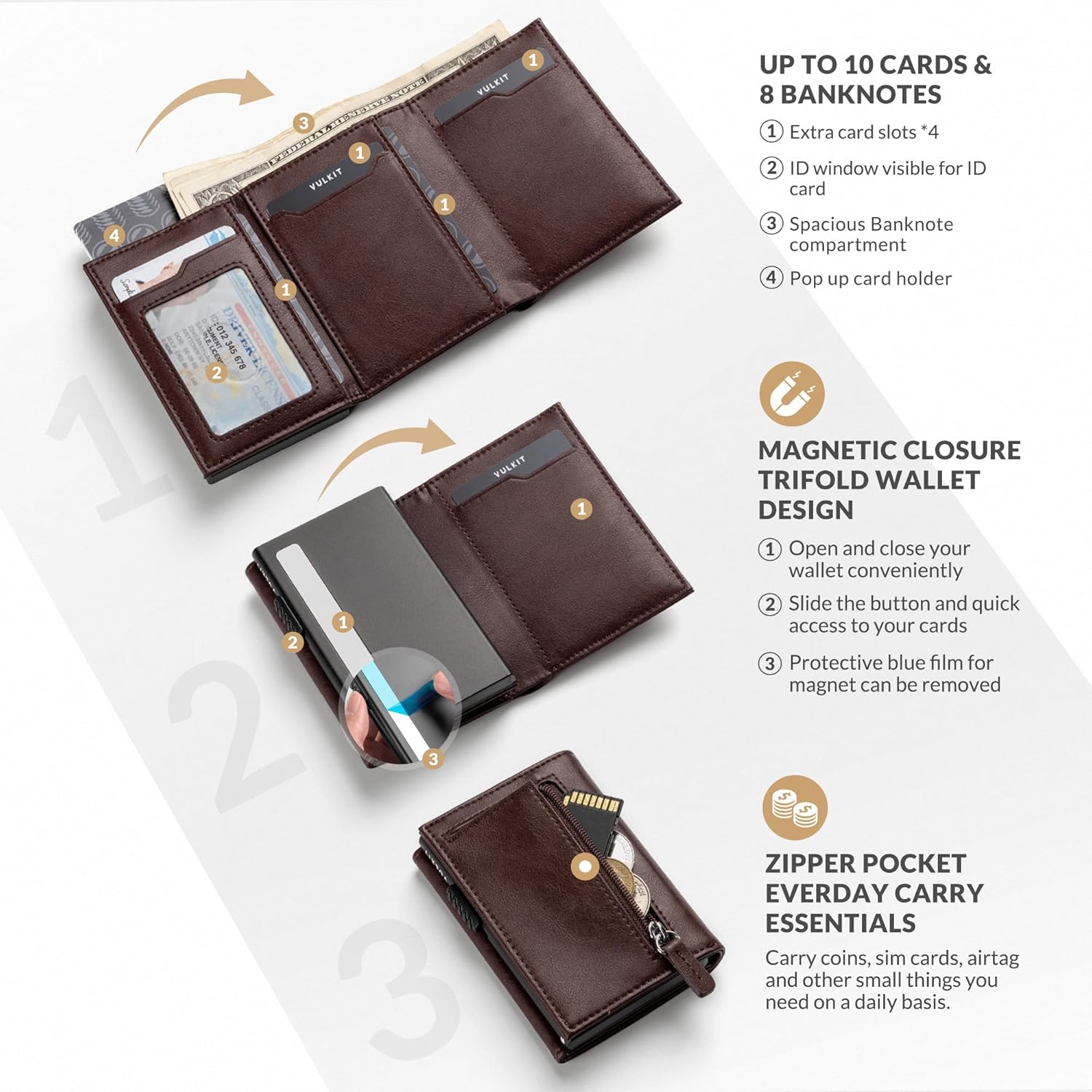 - Multifunktional und Dennoch Kompakt - Halten Sie 5 Karten in einem Aluminium-Kartenetui, 4 zusätzliche Kartenfächer und 1 Ausweisfenster sowie ein Münzfach mit Reissverschluss und ein Geldscheinfach für die meisten Arten von Weltwährungen wie GBP,