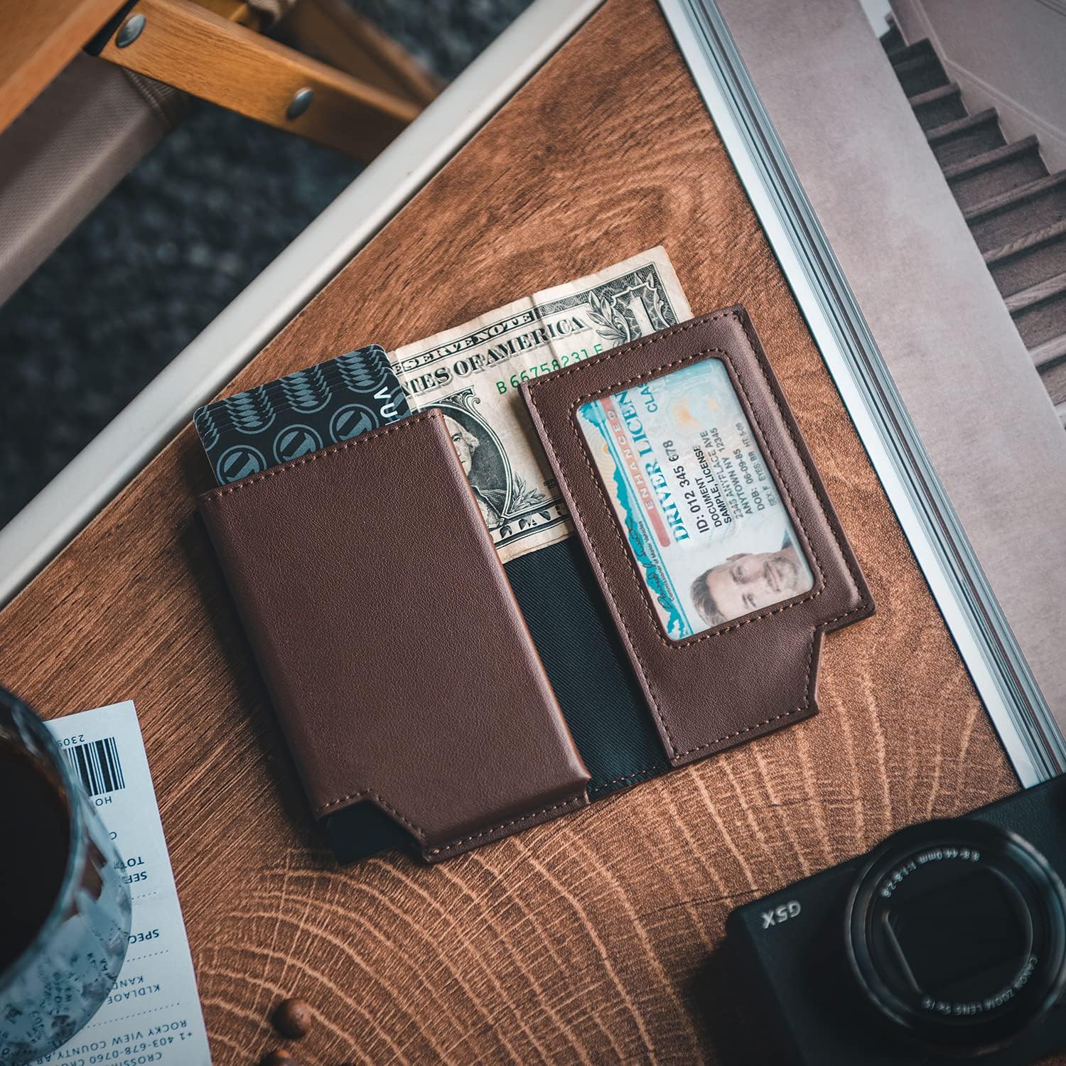 - ZUSÄTZLICHES FACH FÜR KARTEN UND RECHNUNGEN – 1 sichtbares Ausweisfenster für zertifizierte Karten, 2 zusätzliche Fächer für Kreditkarten und 1 Geldscheinfach.