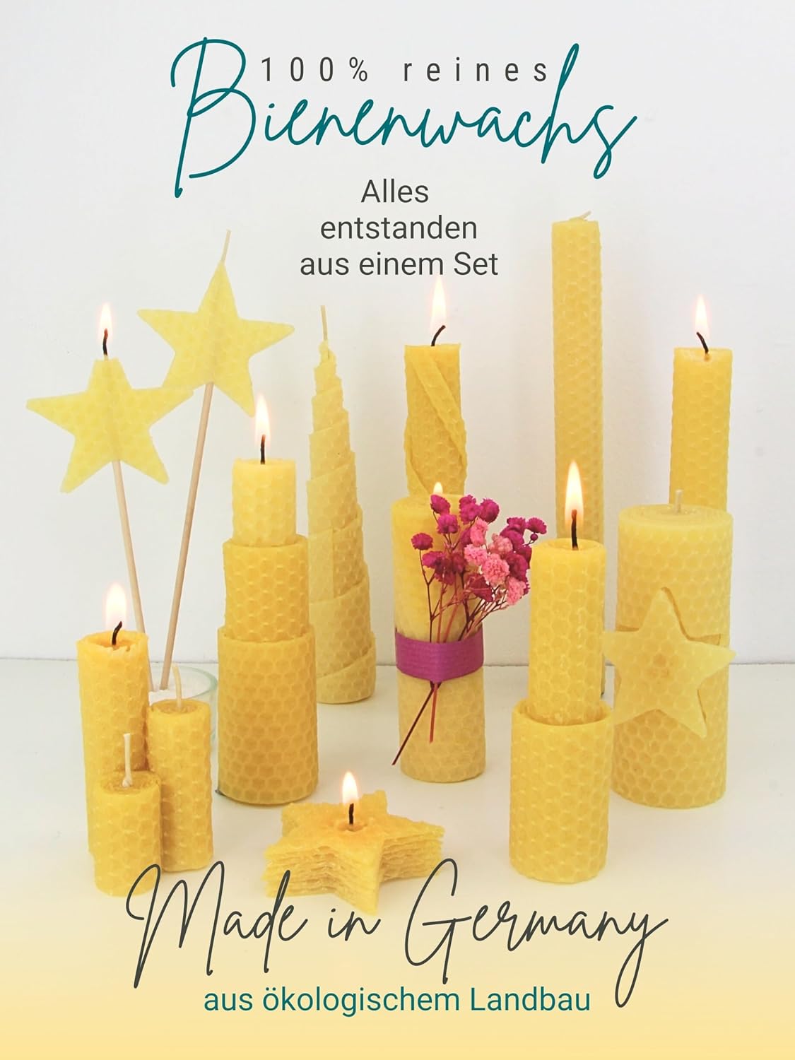 - 🕯️ DEIN KOMPLETTES STARTERSET FÜR 10 KERZEN – Alles drin, was Du brauchst: 10 farbige Bienenwachsplatten (20 × 15 cm), 10 vorgewachste Hanfdochte (21 cm Länge) und eine ausführliche, bebilderte Anleitung. Ideal, um sofort loszulegen – auch