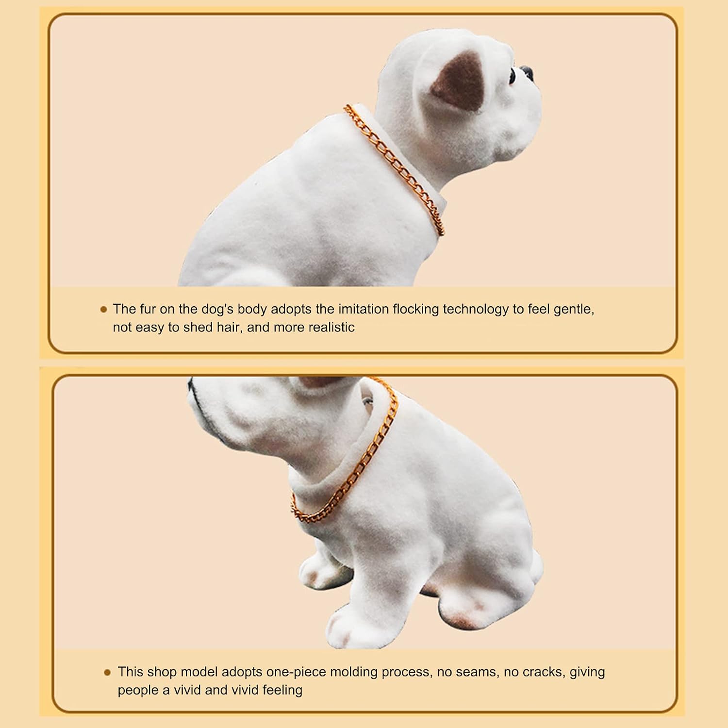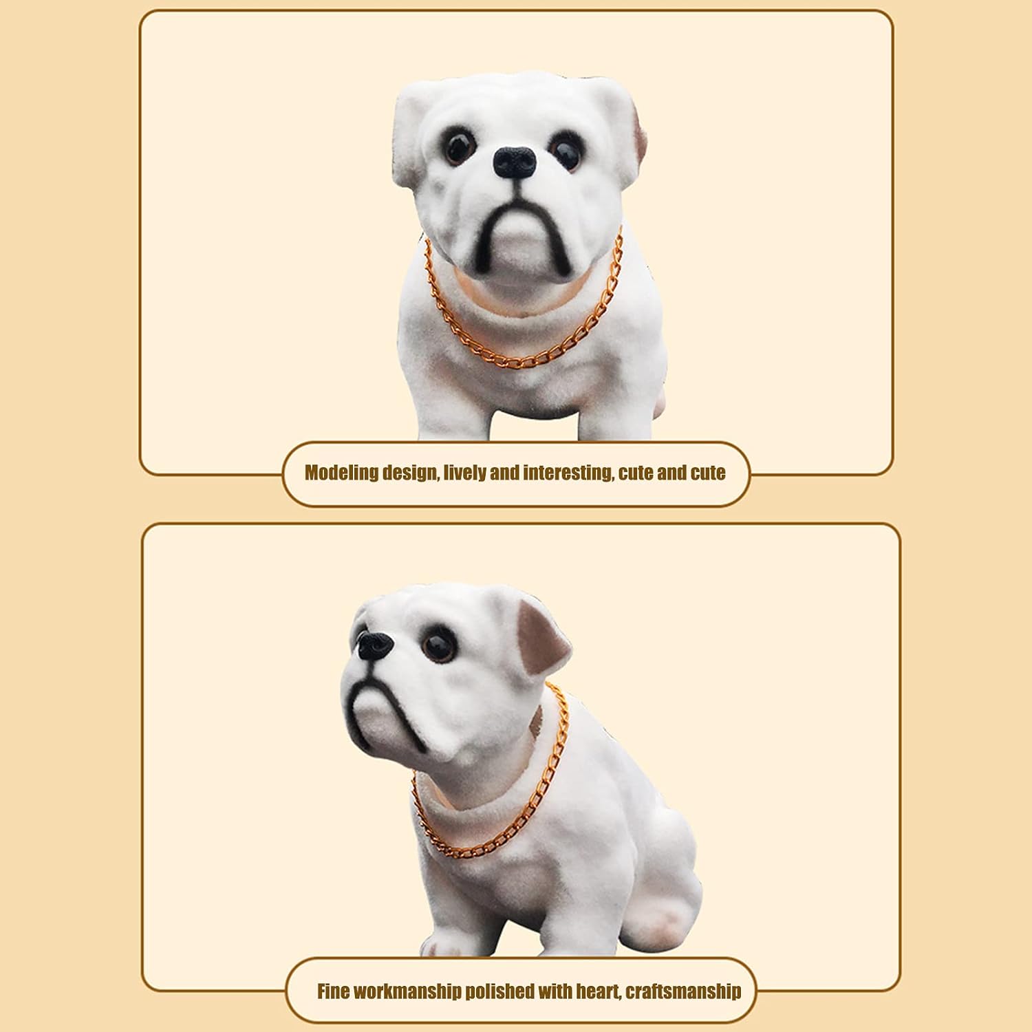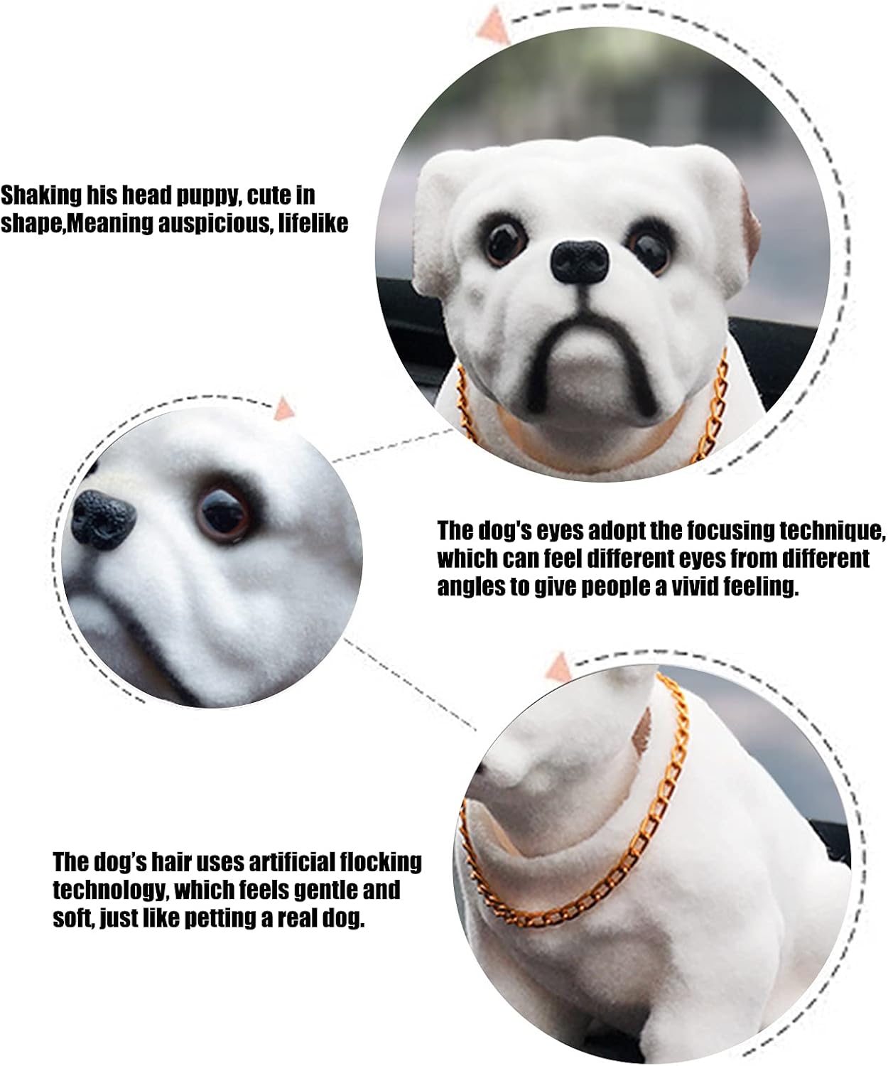 • Einfache Installation: Der Auto-Wackelkopfhund ist einfach zu installieren und kann einfach mit selbstklebendem Papier auf die Autoverkleidung geklebt werden. Der Kopf des Hundes bewegt sich bei der Bewegung hin und her.