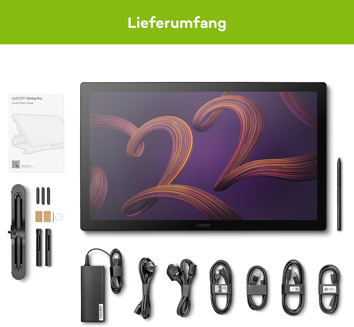 - Lieferumfang: Wacom Cintiq Pro 22, USB-Typ-C-Kabel (1,8 m), USB-Typ-C-zu-A-Kabel (1,8 m), HDMI-2.1-Kabel (1,8 m), DisplayPort-1.4-Kabel (1,8 m), Netzkabel (1,0 m), AC-Netzteil, Wacom Pro Pen 3, Stiftablage, Schnellstartanleitung, Verordnungsblatt