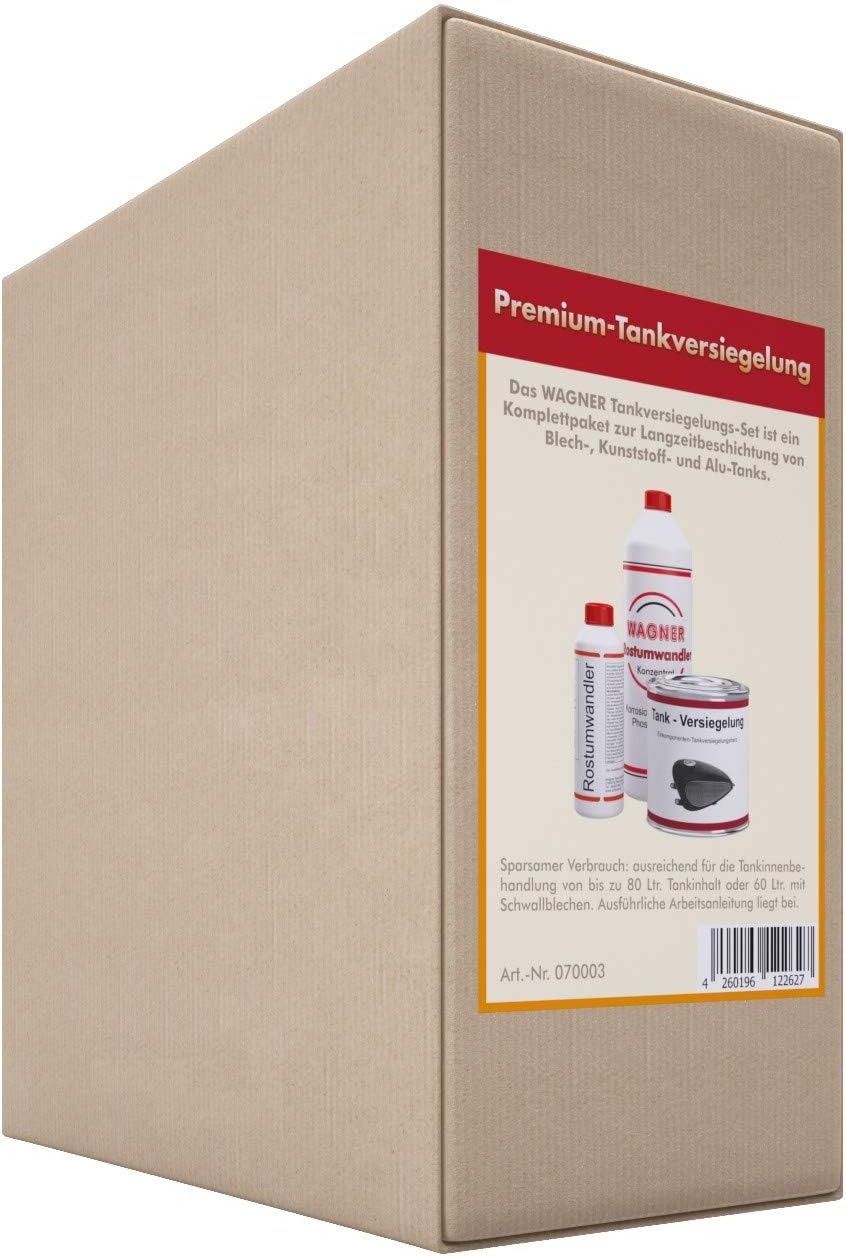 - Bestehend aus 1 Liter+250 ml WAGNER phosphatierendem Rostumwandler und 500 ml transparentem WAGNER Einkomponenten-Tankversiegelungsharz.