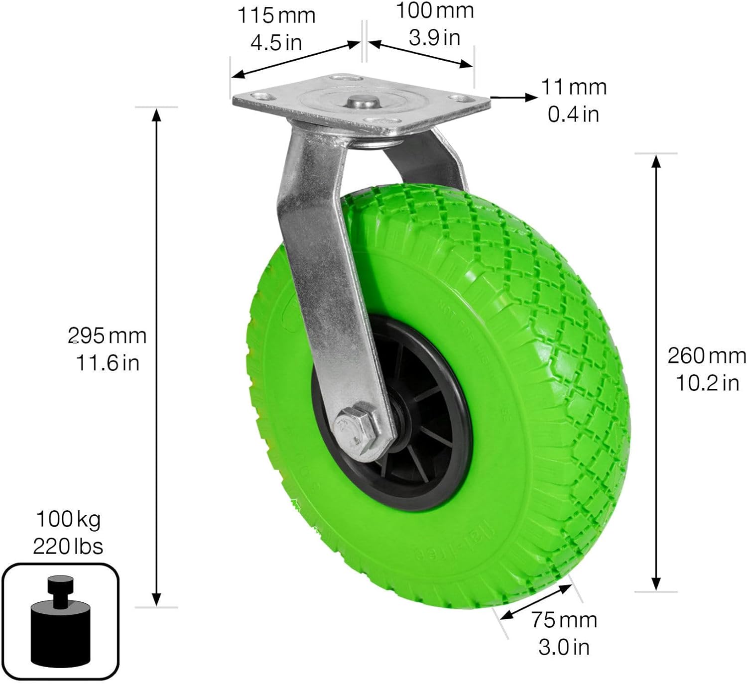 • Raddurchmesser Ø 260 mm, Breite 75 mm, Achslochdurchmesser Ø 20 mm, Bauchhöhe 300 mm, Anschraubplatte 115 x Tragkraft 100 kg