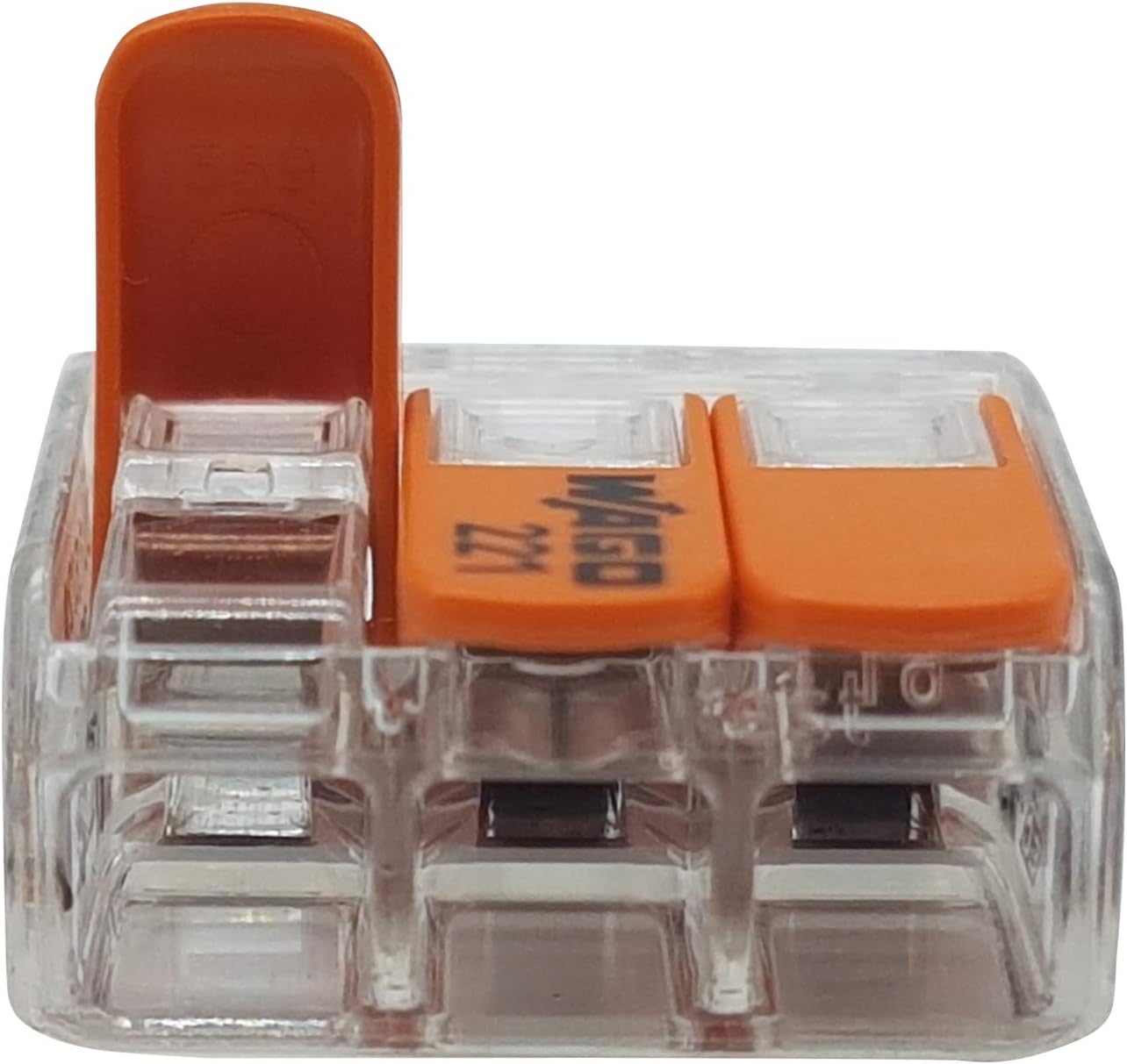 • WAGO Hebel-Verbindungsklemme, 3-polig für starre (0,2 - 4 mm²) und flexible (0,14 - 4 mm²) Drähte zum wieder öffnen transparent/orange - 400 Volt - 32 Ampere