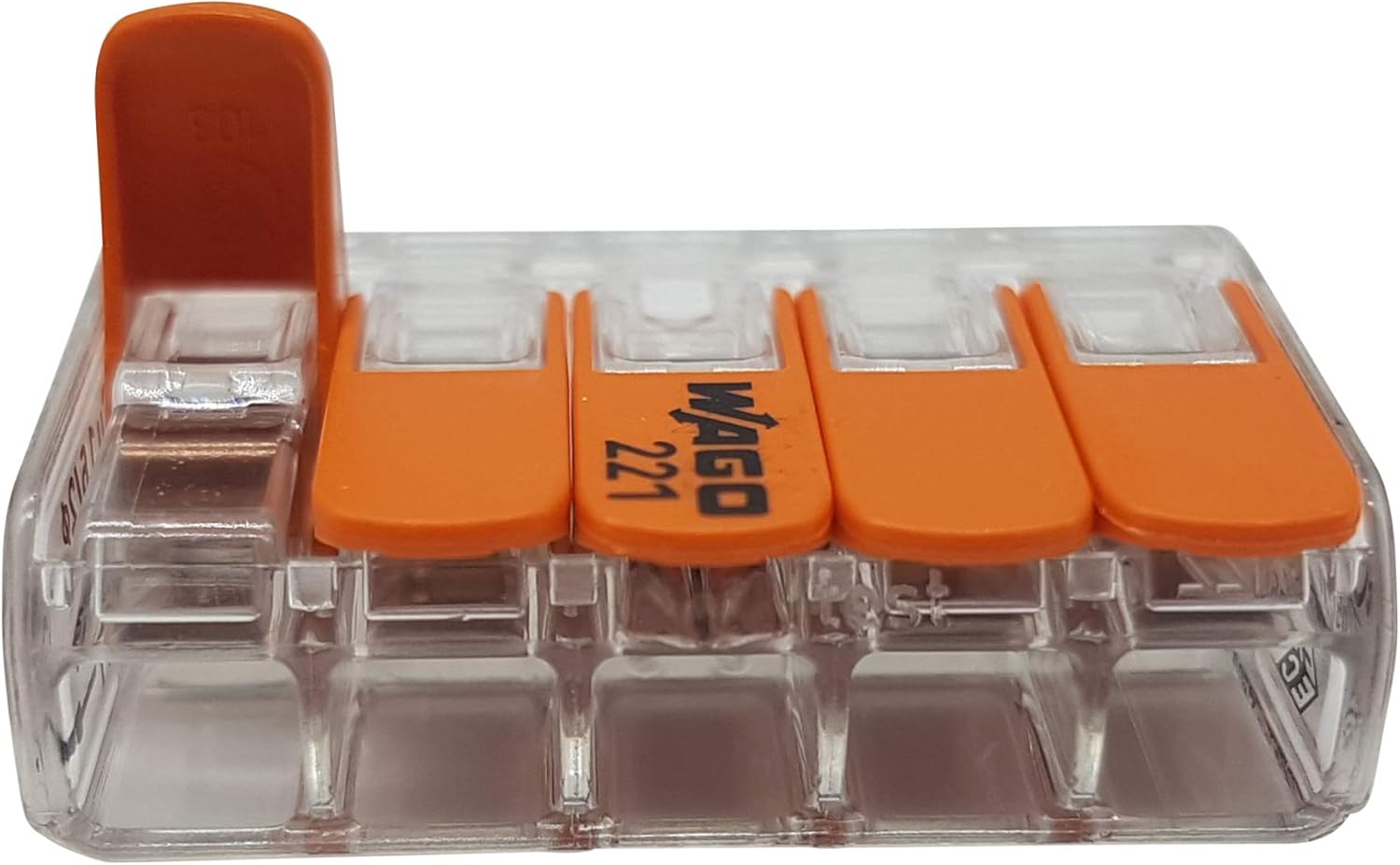 • WAGO Hebel-Verbindungsklemme, 5-polig für starre (0,2 - 4 mm²) und flexible (0,14 - 4 mm²) Drähte zum wieder öffnen transparent/orange - 400 Volt - 32 Ampere