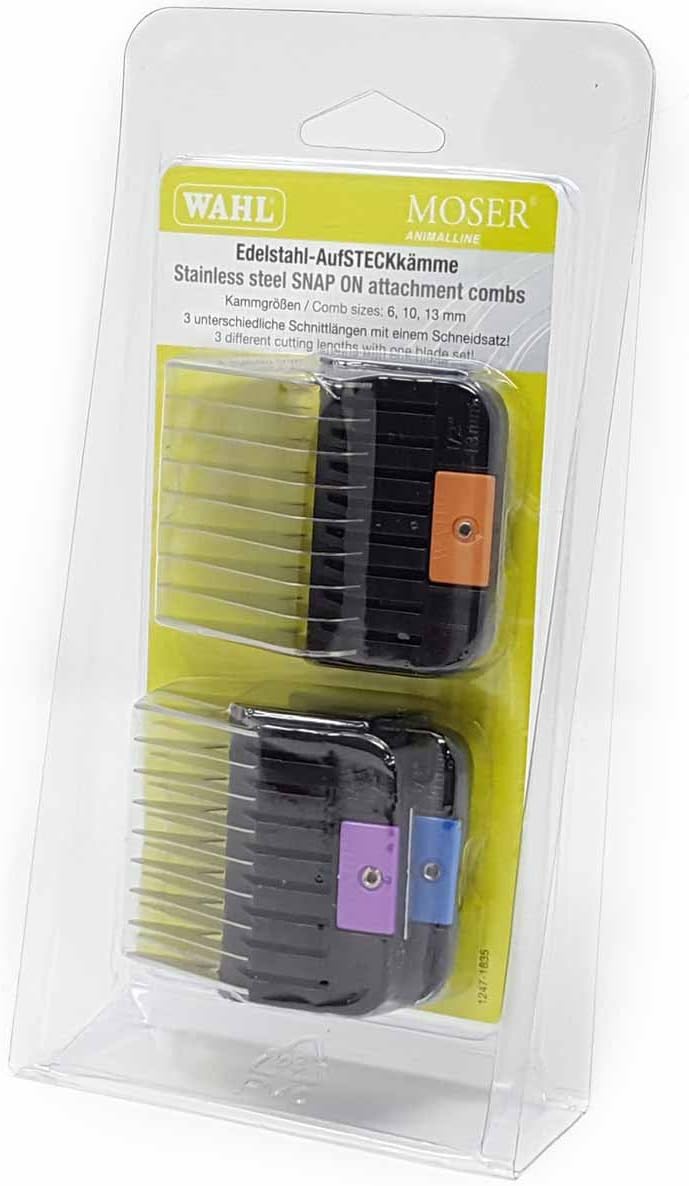 PRODUKTBESCHREIBUNGEN Moser WAHL Aufsteckkamm - Set 1247-7445 (3-er) Edelstahl 6mm, 10mm, 13mm MOSER / WAHL Metallaufsteckkämme aus Edelstahl für MOSER MAX 50, MOSER MAX 45 , Oster Schermaschine Golden A5, A6 Comfort, Pro3000i. Original Zubehör! Professionelles Moser / Wahl Aufsteckkammset aus Edelstahl! Die neuen Aufsteck - Kämme sorgen für ein gleichmässiges Finish. Highlights: Edelstahl erhöht die Lebensdauer und Stabilität. Sicherer Sitz durch Einrasten am Schneidsatz. Farbleitsystem für einfache Erkennung der Kammgrösse. Formstabiler als herkömmliche Kunststoff-Aufsteckkämme. Für eine zeitsparende Schur und ein gleichmässiges Scherergebnis. Sie eignen sich besonders bei: Langhaarhunden dichtem / starkem Fell starker Unterwolle Schnittlängen der Aufsteckkämme: 6 mm 10 mm 13 mm