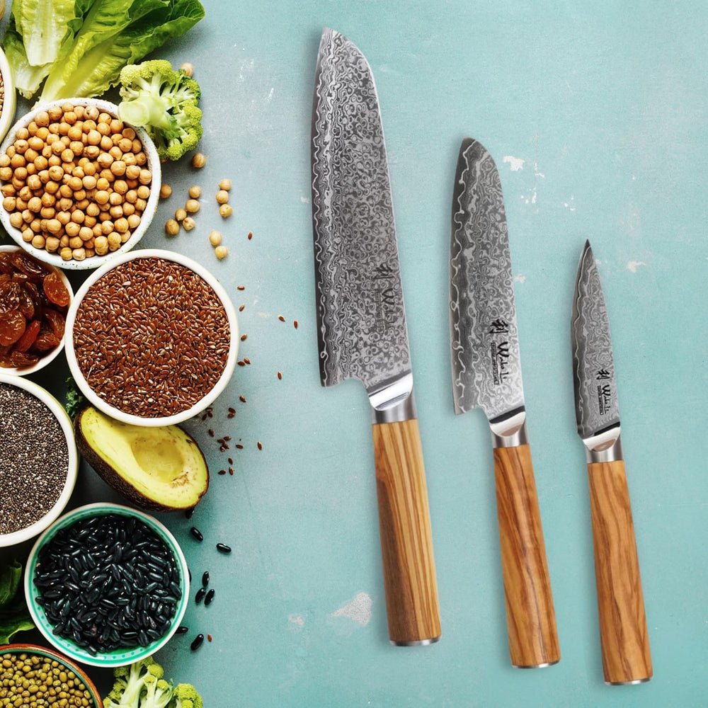 - 🔪 MESSEREIGENSCHAFTEN - Die Profi Damastmesser mit Olivenholzgriffen haben eine Klingenlänge von 9,00 - 18,00 cm