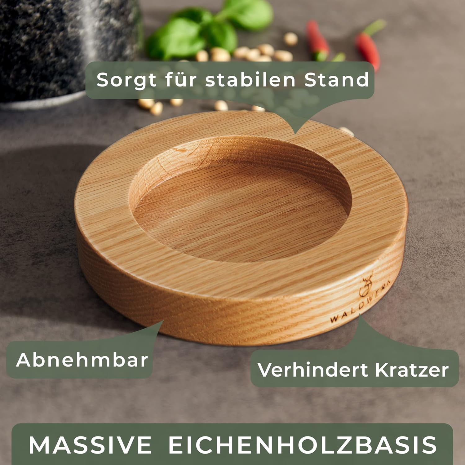 - 🌿 BOMBENSICHERER STAND - dank der extra breiten Basis aus edlem Eichenholz. Diese hält deinen WALDWERK Mörser beim Mahlprozess sicher auf Position. Keine Sauerei und mehr Freude beim Mahlen!