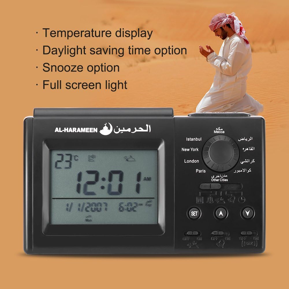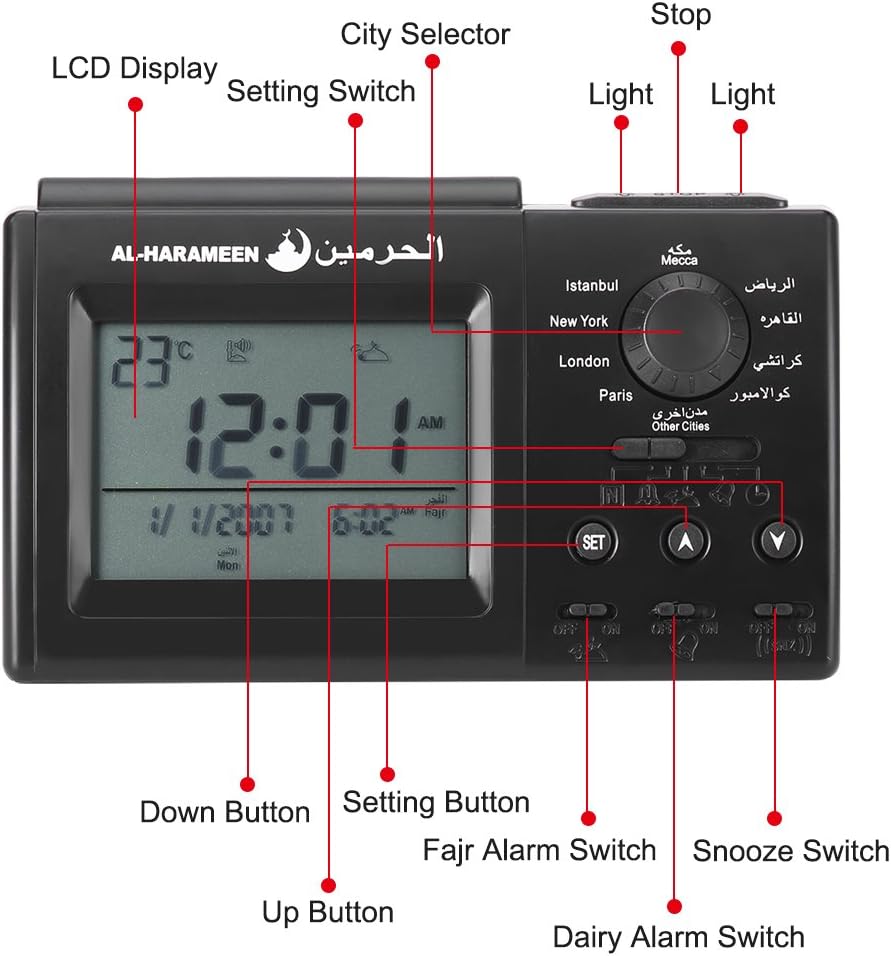 - Einfach zu bedienen: Beende Azan für alle fünf Gebete. Die Lautstärke kann mit einem Wählschalter gesteuert werden oder es kann 3-mal anstelle von azan piepsen