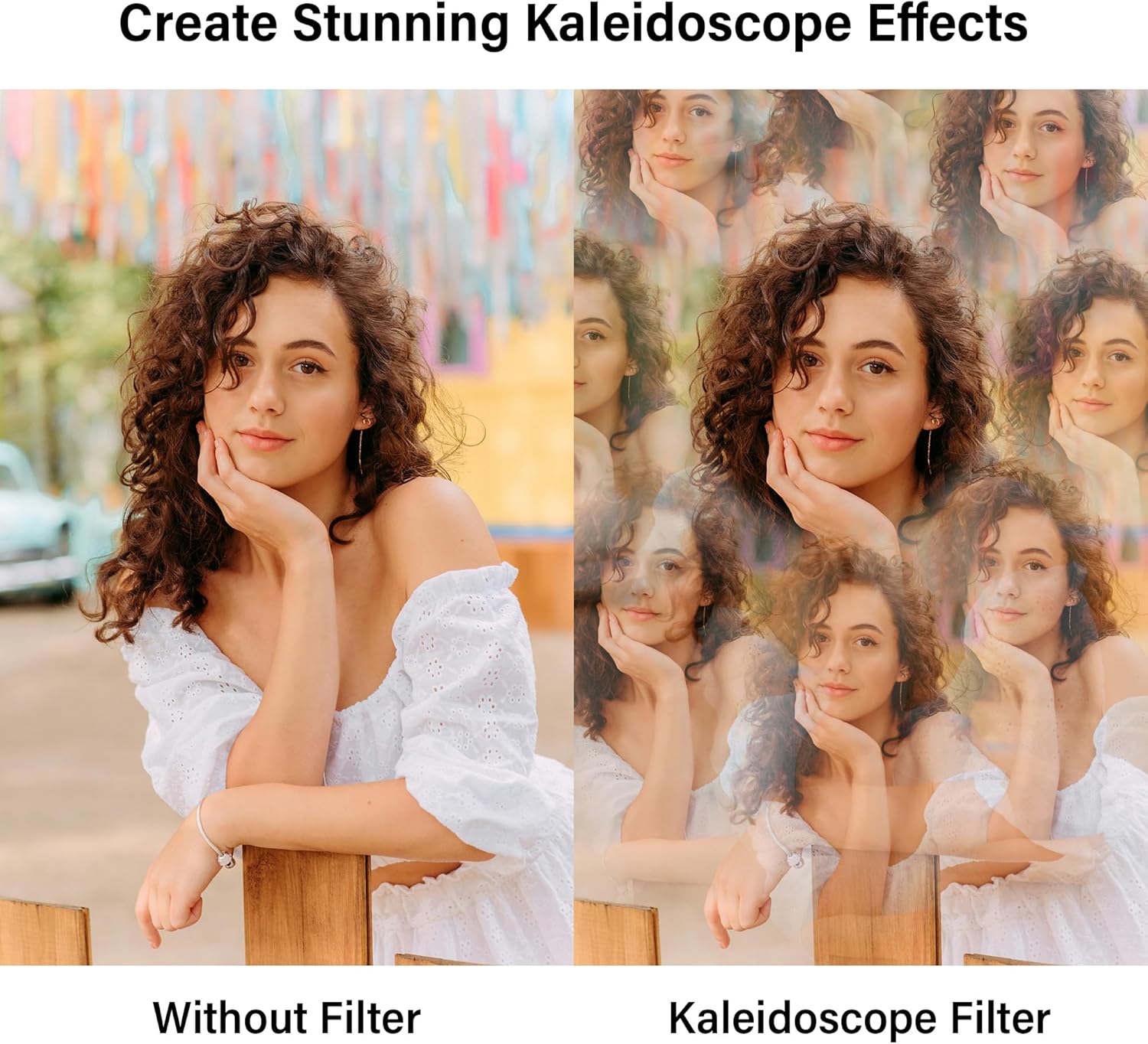 - 【Magischer Kaleidoskop Effekt】 Der Kaleidoskop Prismenfilter erzeugt wiederholte, aber einzigartige Elemente in der Szene und einen coolen Refraktionseffekt mit verschiedenen Winkeln, ohne dass spezielle Bearbeitungssoftware erforderlich ist.