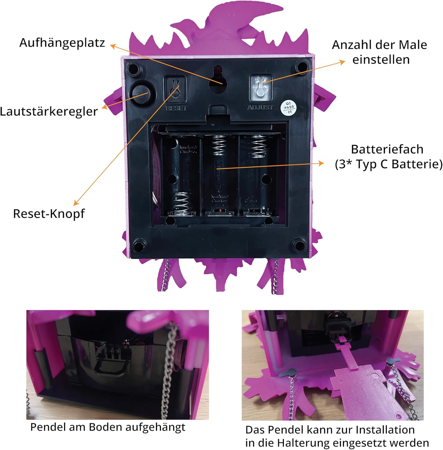 - Kuckuckvogel springt aus und singt einmal jede Stunde von 6 bis 21 Uhr.