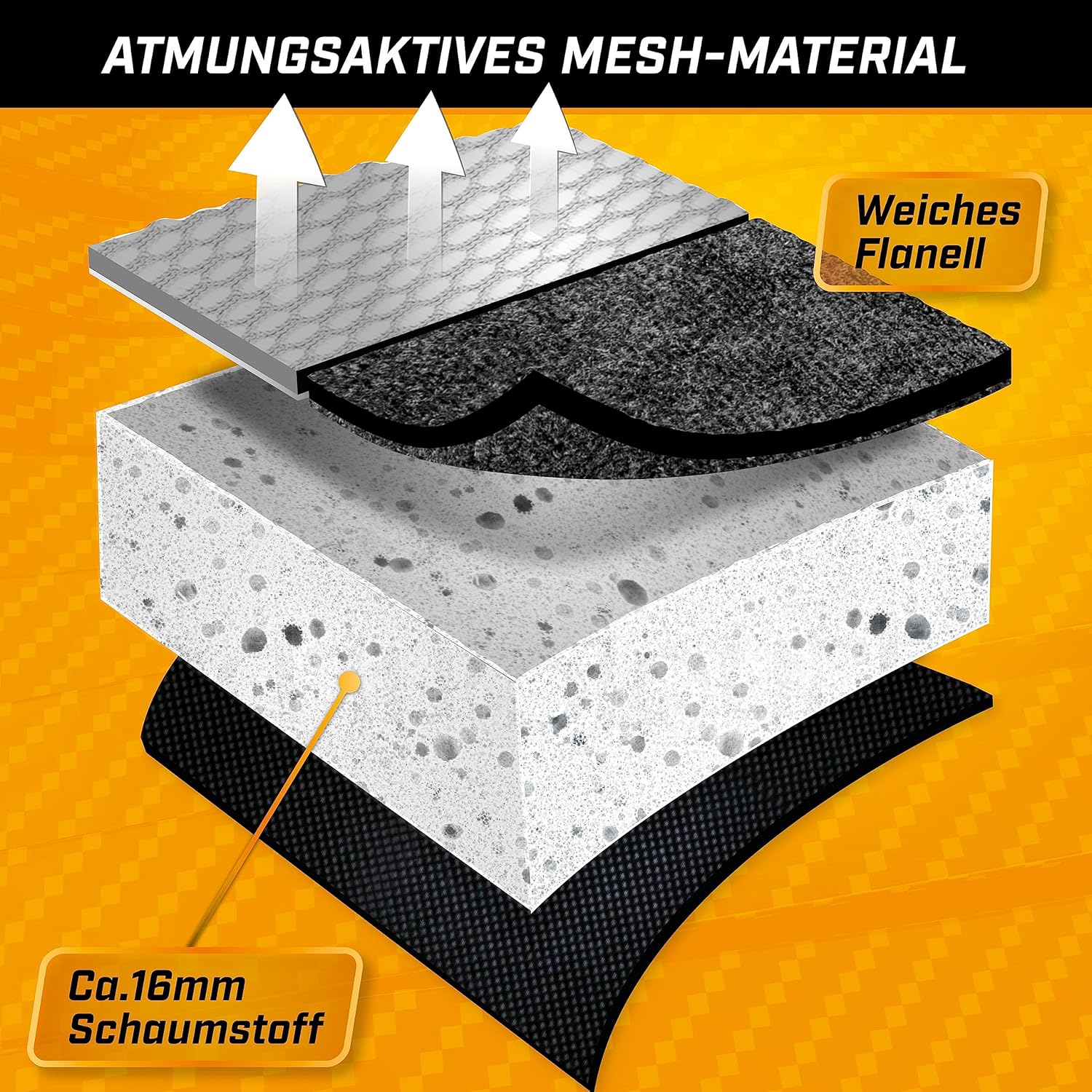 - Angenehmer Sitzkomfort: Dank 16 mm dicker Schaumstoff-Polsterung bietet der Sitzschoner angenehmen Sitzkomfort - auch bei längeren Fahrten. Zudem sorgt das Polyester Mesh kombinierte Material mit Velours für optimale Belüftung