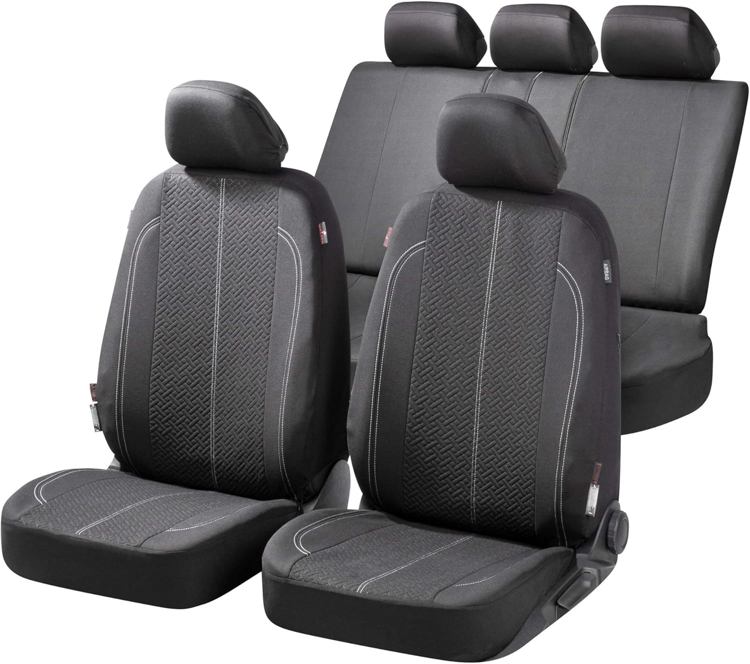 - Lieferumfang: 2 Vordersitzbezüge 2tlg, 1 Rücksitzbezug 5tlg, 5 Kopfstützenbezüge