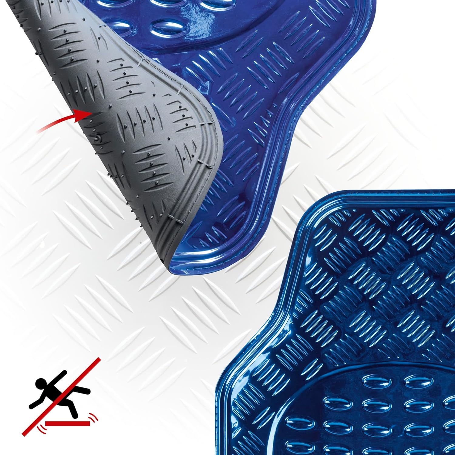 - Mehr Sicherheit: Die anti-rutsch Spikes auf der Rückseite machen die Fussmatten rutschfest und sorgen für erhöhte Sicherheit im Strassenverkehr.