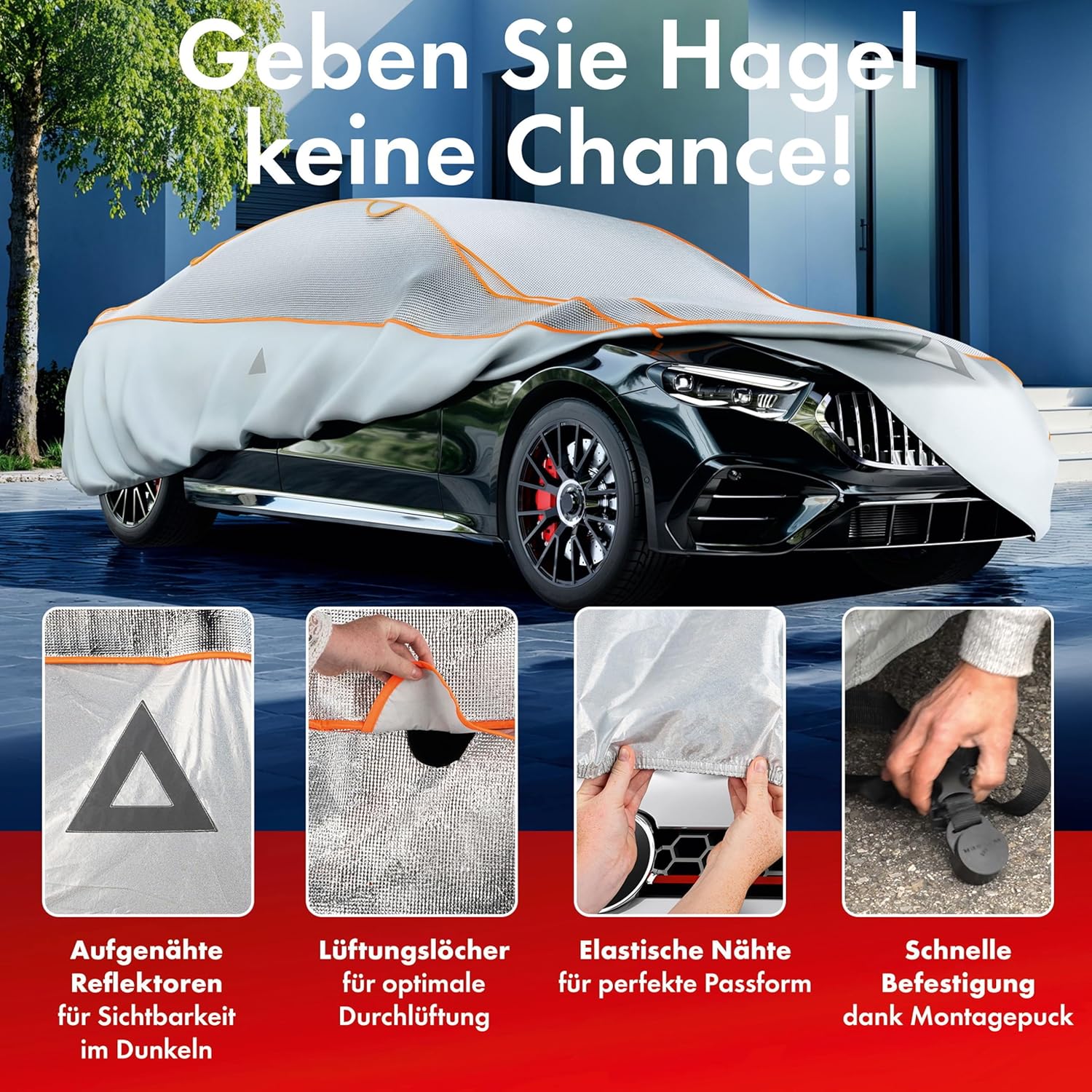 - ZUVERLÄSSIGER HAGELSCHUTZ: Die wetterfeste und 100% wasserdichte Abdeckplane Auto wurde unter kontrollierten Bedingungen (500 Stunden Bewitterungstest) geprüft. Die Plane absorbiert normale Hagelschauer (Durchmesser ca. 23,7 mm, 7.049 mm3,