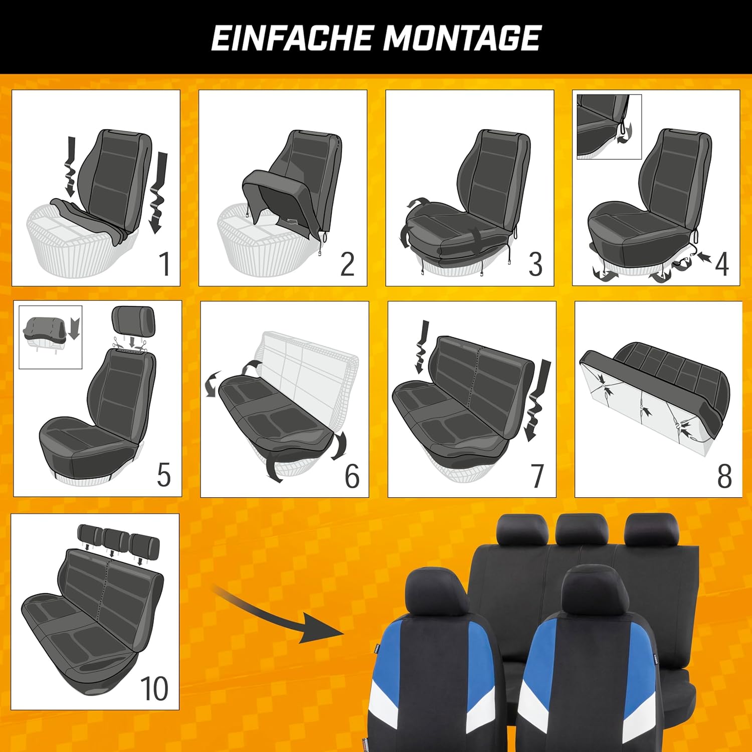- Lieferumfang: Das Komplettset enthält 2 Vordersitzbezüge, 1 Rücksitzbezug sowie 5 Kopfstützenbezüge.