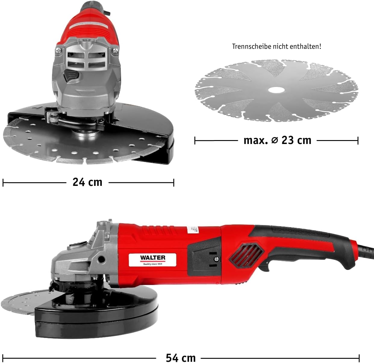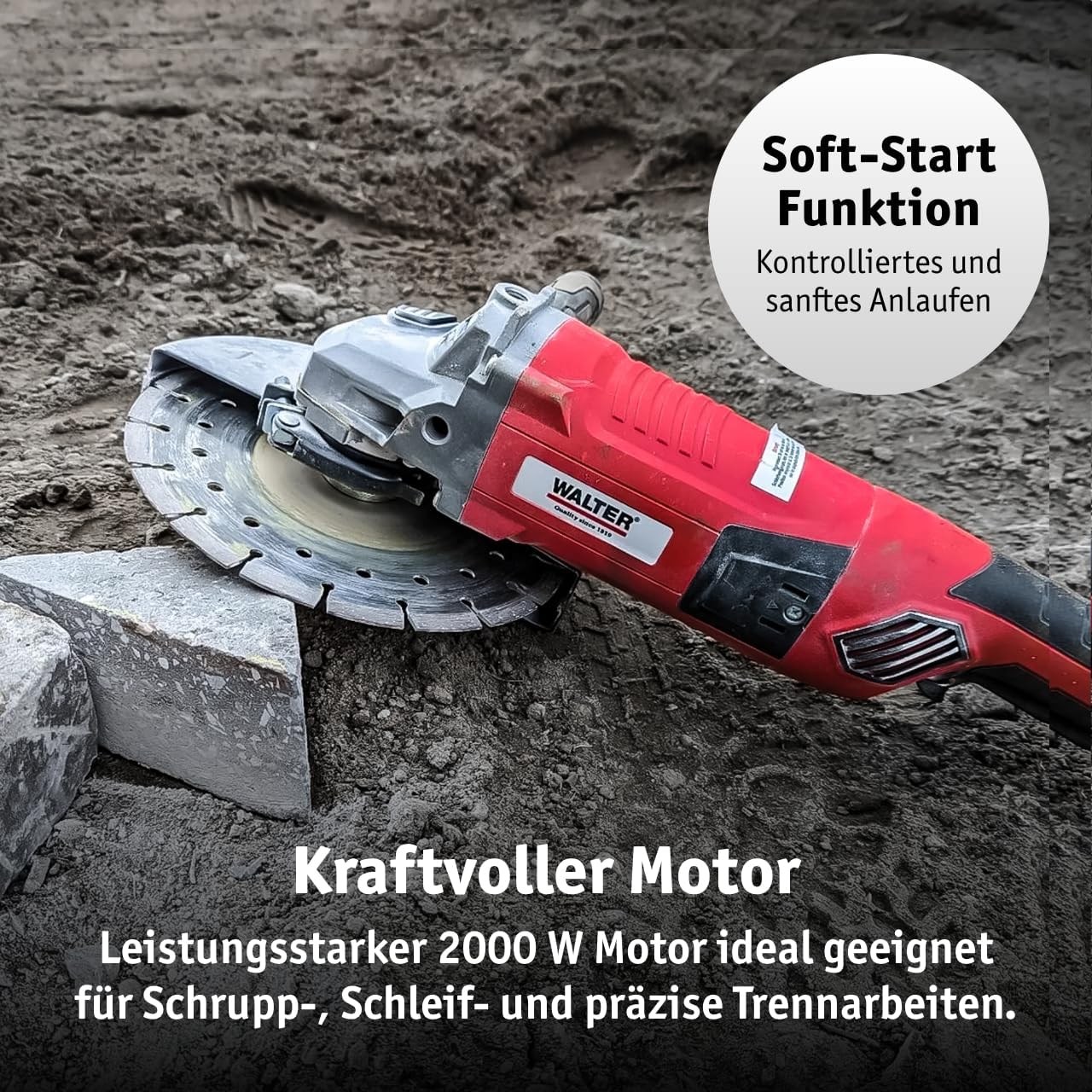 - Der leistungsstarke WALTER Winkelschleifer mit 2000 W und einer Standardgrösse von 230 mm eignet sich perfekt zum Schleifen, Trennen und Schruppen verschiedener Materialien.