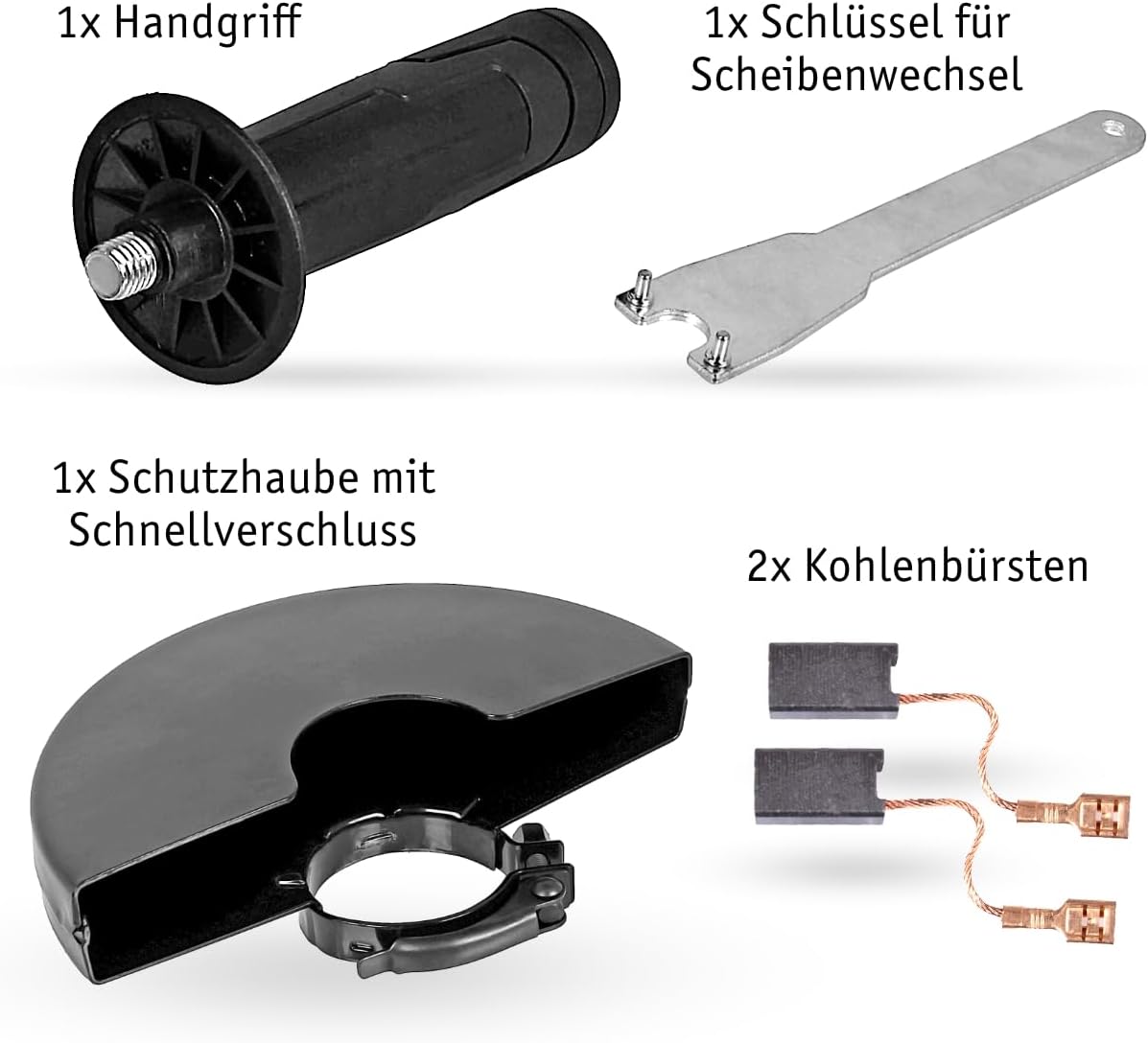 - Der Lieferumfang des WALTER Winkelschleifers umfasst den Winkelschleifer selbst, einen praktischen Zusatzhandgriff zur Anpassung an individuelle Bedürfnisse, einen Schlüssel für den bequemen Scheibenwechsel, ein Paar Kohlebürsten für die Wartung des