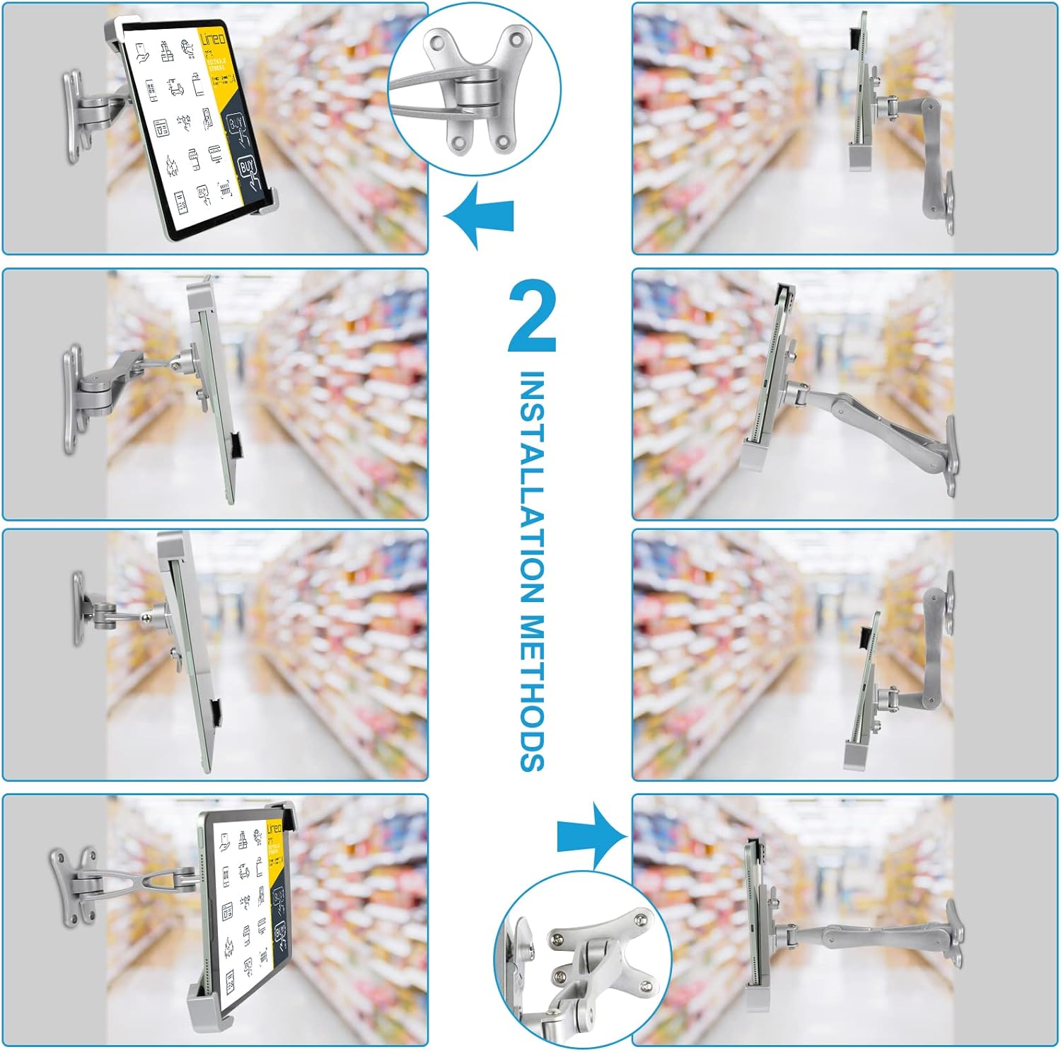 - 【Vielfach winkelverstellbar】Der ipad wallhalterung mit schloss hat drei verstellbare Gelenke, so dass die Arme nach oben und unten, links und rechts eingestellt werden können, und die Arme können hochgeklappt werden, wenn sie nicht in Gebrauch