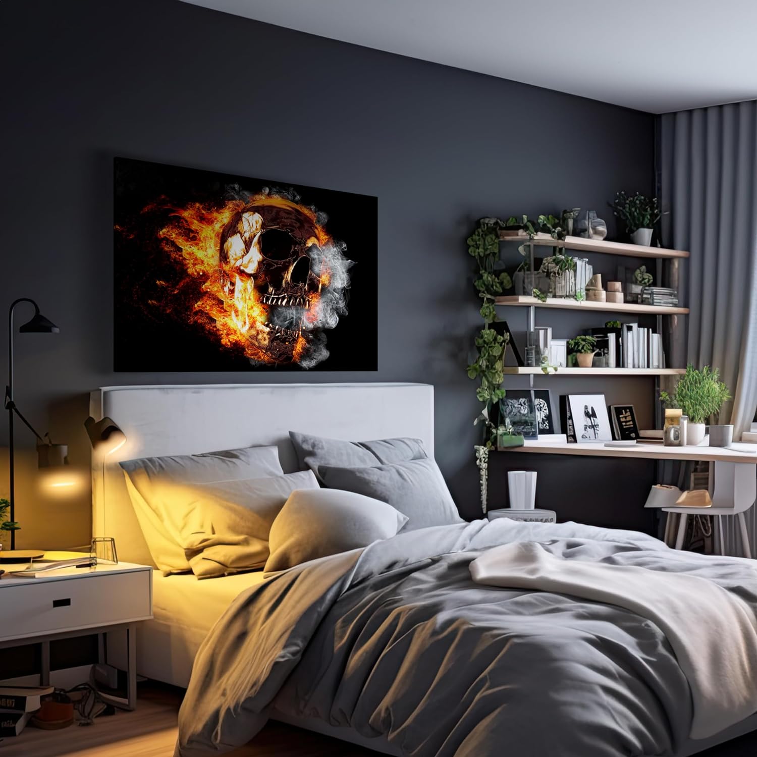 wandmotiv24 Leinwand-Bilder Totenköpfe, Grösse 60x45cm, Querformat, Totenkopf in Feuer & Flamme, Rau