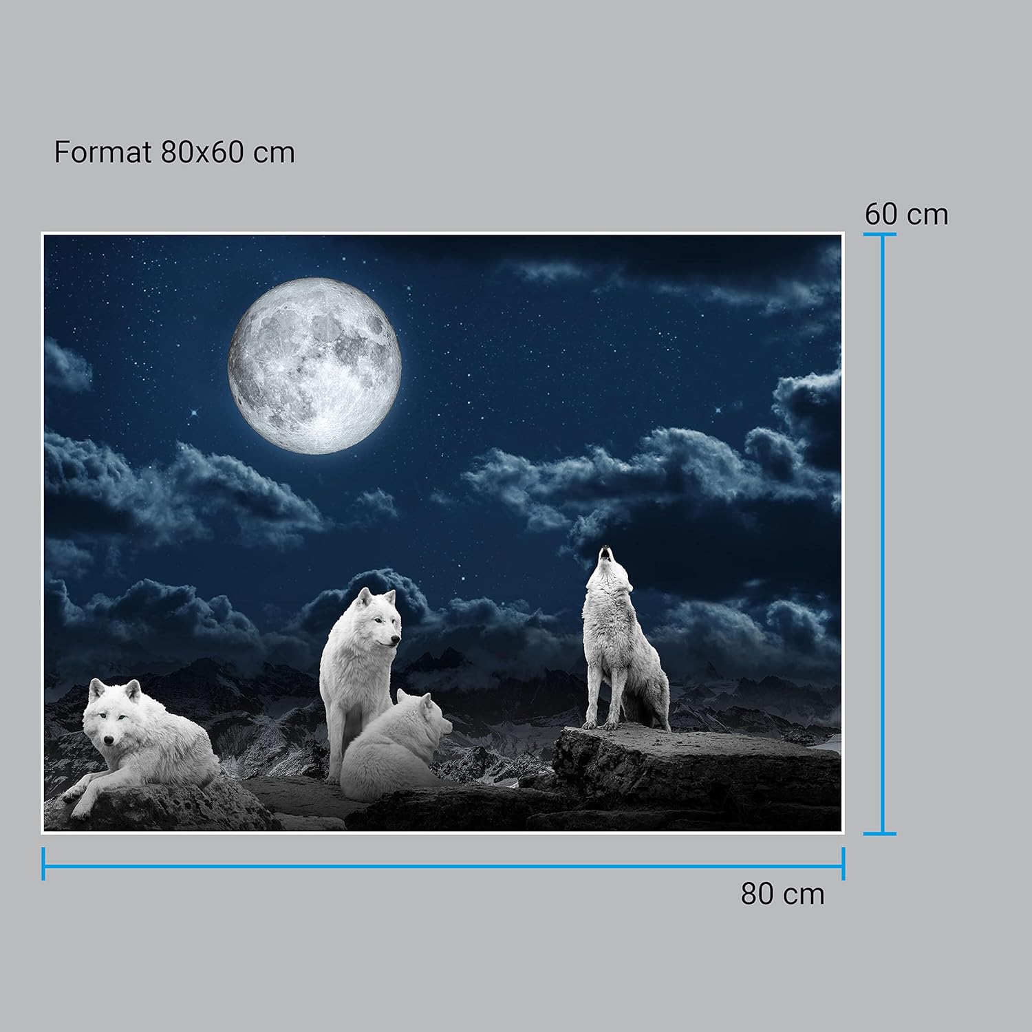 wandmotiv24 Poster als Wanddeko, Grösse 80x60cm, Wolfsrudel, Wolf, Gemälde, Mond, Wölfe, Felsen, Tie