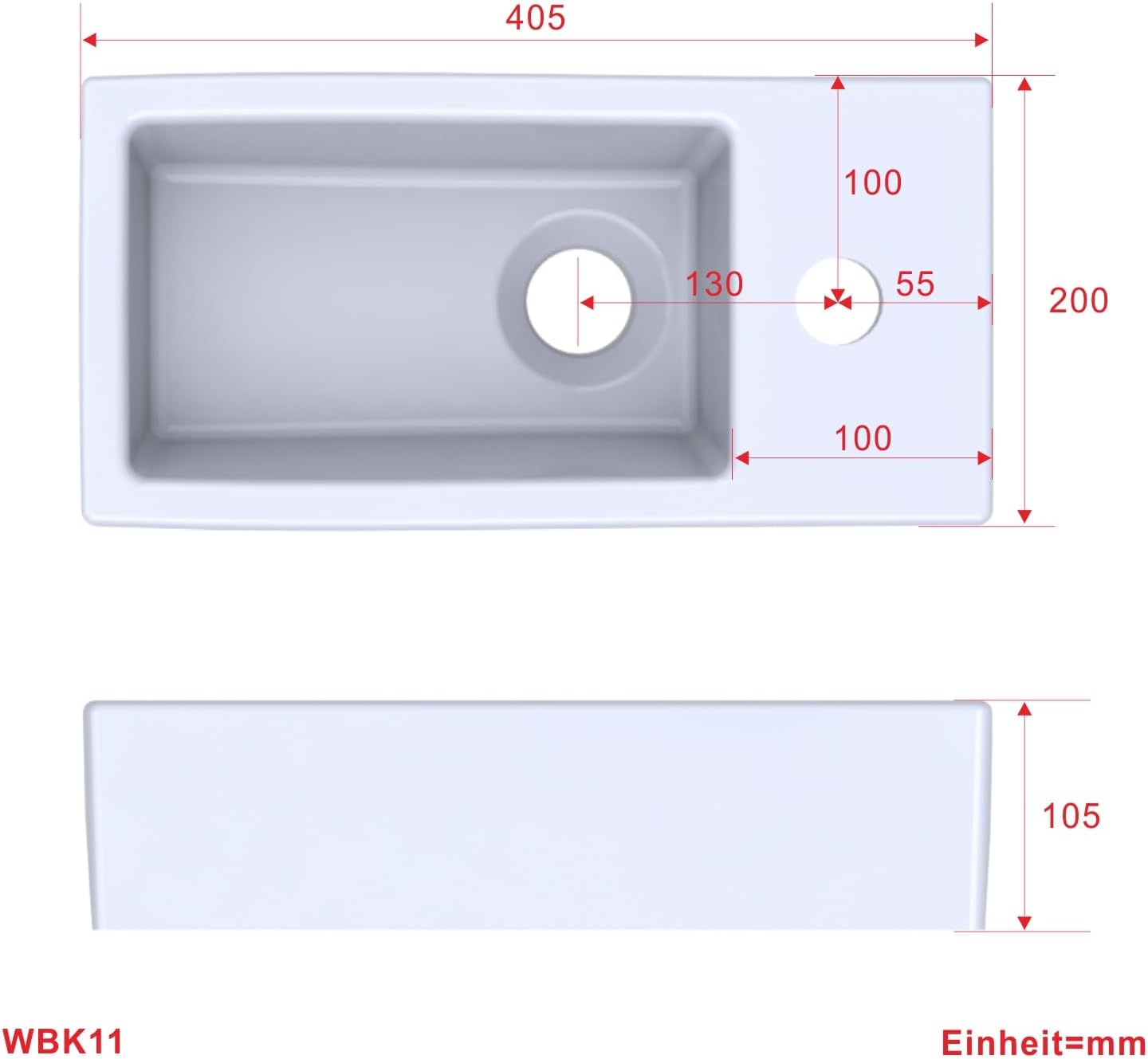 - 【Rechts platziertes Hahnloch】Das vorgefertigte Hahnloch zum Anschliessen einer Einlocharmatur befindet sich auf der rechten Seite des Handwaschbeckens. Das Handwaschbecken wurde ohne Überlauf gefertigt. Das Hahnloch ist nicht im Lieferumfang