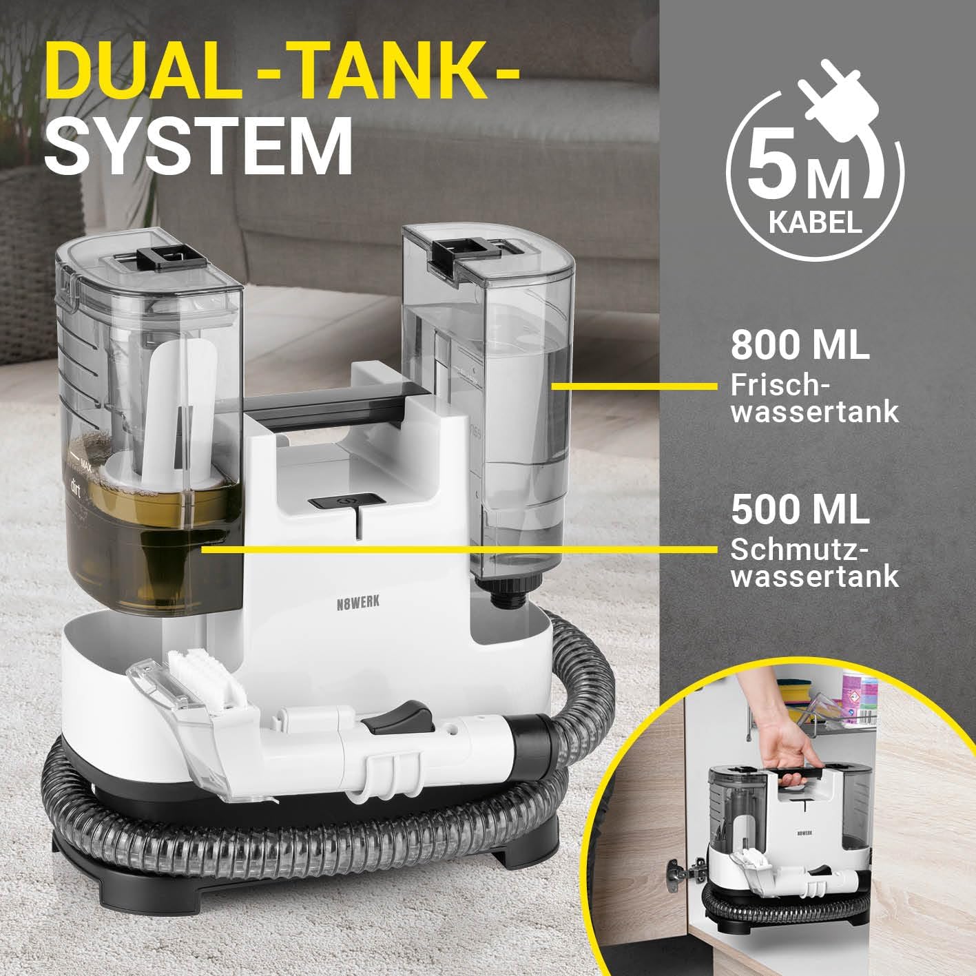 - 2IN1 REINIGUNG - Aufsprühen und absaugen: Der Waschsauger mit 2-Tank-System sprüht Frischwasser tief in die Fasern und löst den Schmutz. Gleichzeitig saugt er den gelösten Schmutz in einer Anwendung direkt wieder ab.