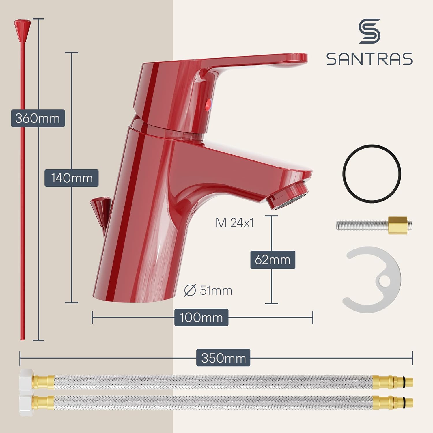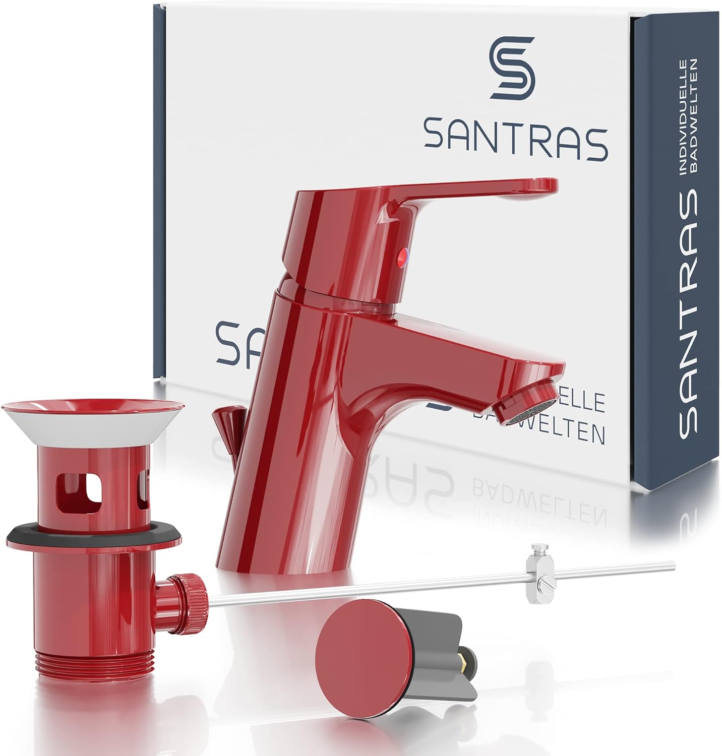 Waschtischarmatur für das Bad mit Exzenter Ablaufgarnitur und Zugstange in Rot – Einhebel-Mischarmat