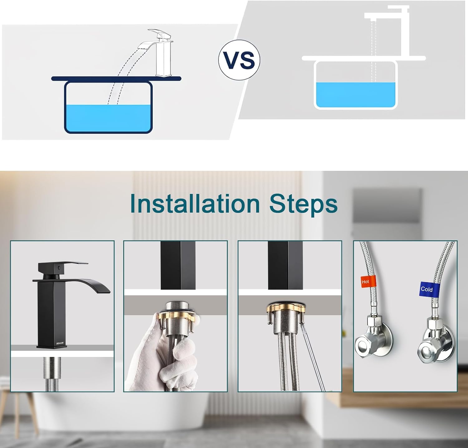 - ✅【Kalt- und Heiss Waschbeckenarmatur】 Der Wasserhahn Bad Wasserfall hat offensichtliche Anzeichen für heisses und kaltes Wasser. Dieser Armatur Waschbecken verfügt über eine Einhebelsteuerung, mit der eine Hand den Durchfluss von heissem und