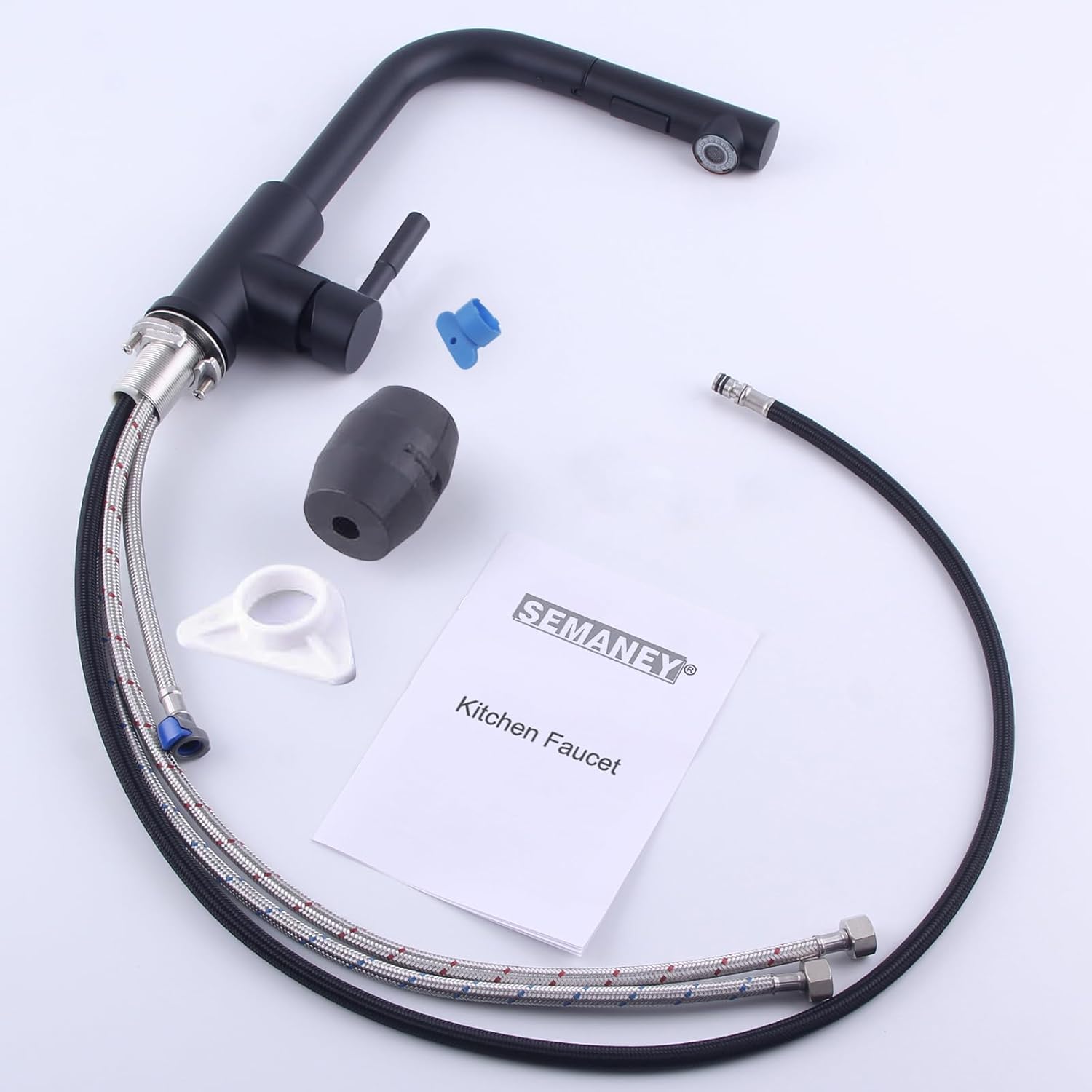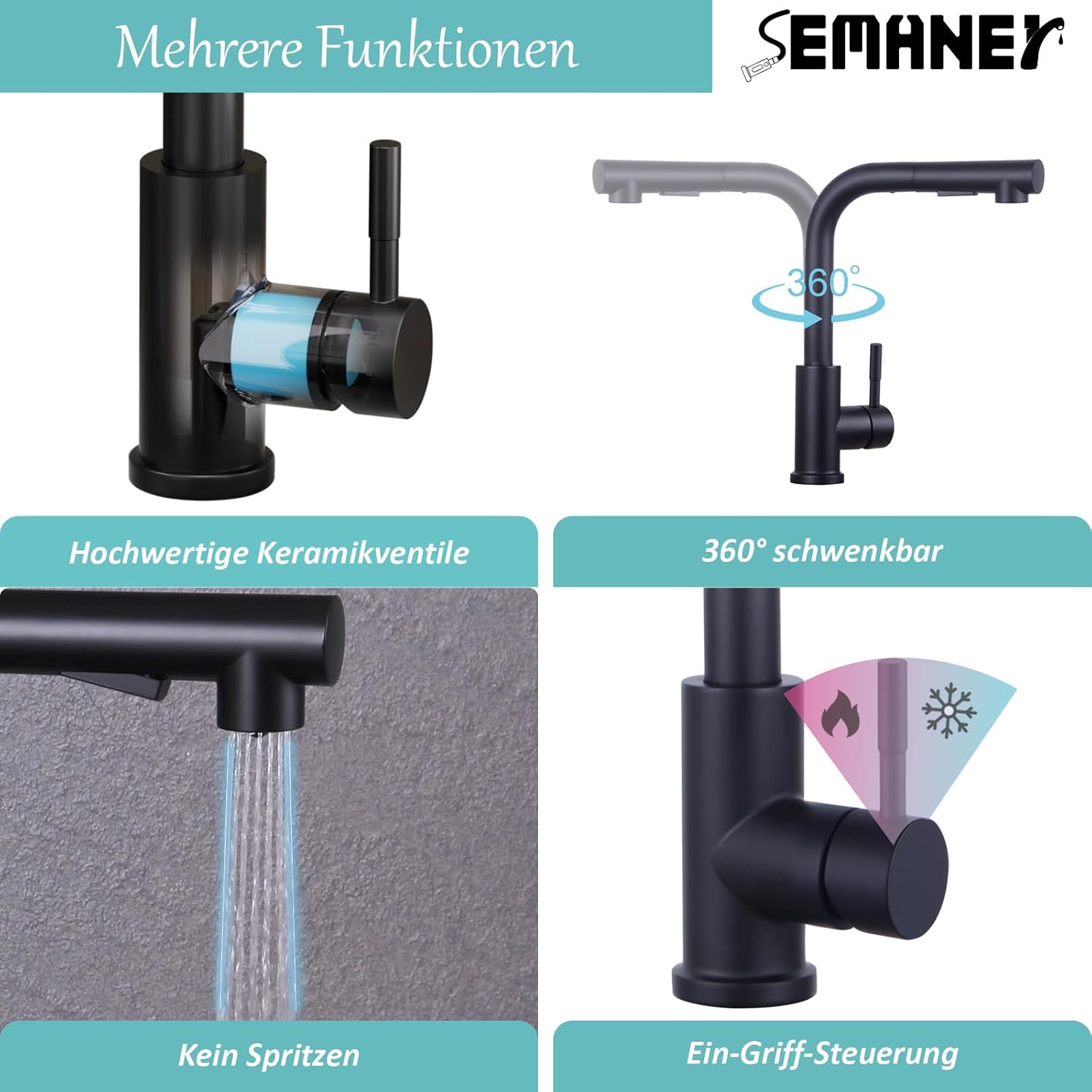 Wasserhahn Küche Schwarz, SEMANEY Hochdruck Küchenarmatur mit Brause Ausziehbar Zwei Strahlarten, Sp