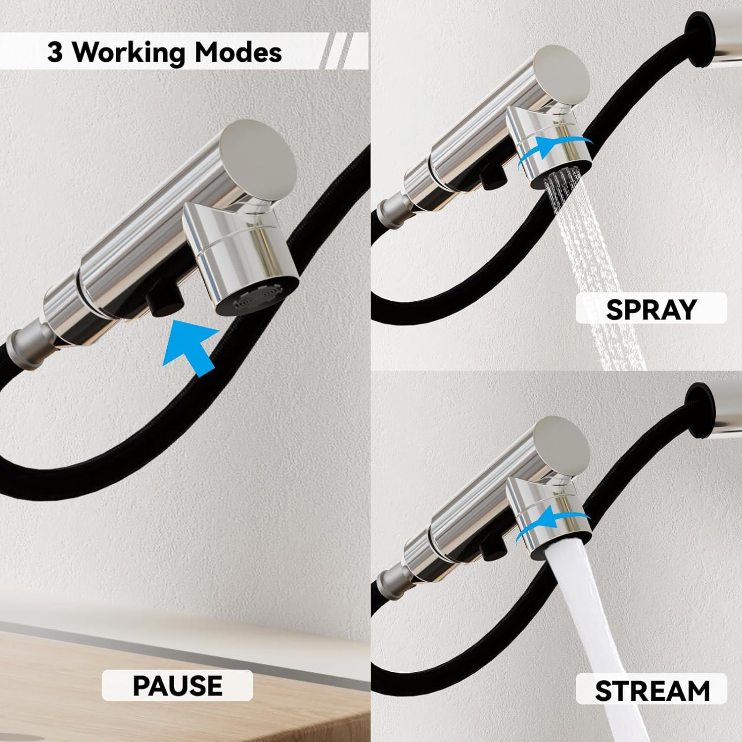 • Brause mit 3 Funktionen: Dieser spülarmaturen küche verfügt über eine Sprühvorrichtung mit 3 Funktionen (Strömen, Sprühen und Pause). Der Sprühen- und der Strömen modus können mit einer drehbaren Düse umgeschaltet werden: Strahlmodus zum
