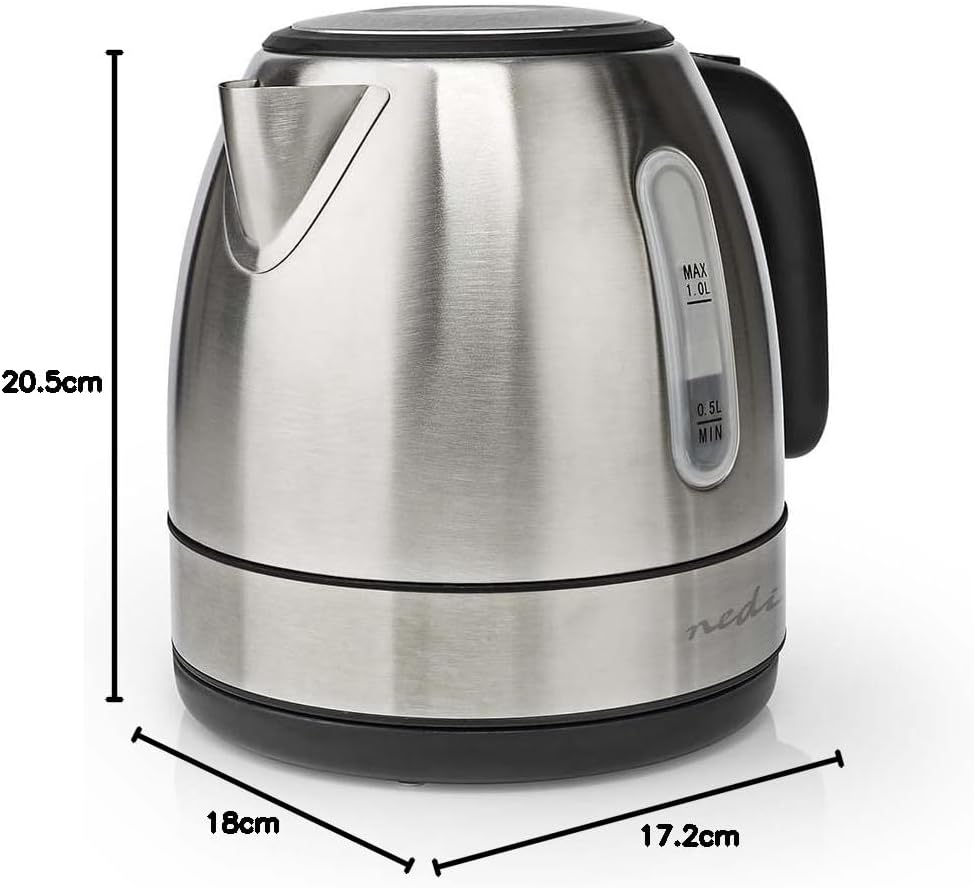 - Lieferumfang: 1 x Nedis Wasserkocher / 1 l / 2200 W / Mit Anti-Kalk-Filter, Anti-Rutschboden, Kontrollleuchte, Wasserstandanzeige, Trockengehschutz und Strix Controller