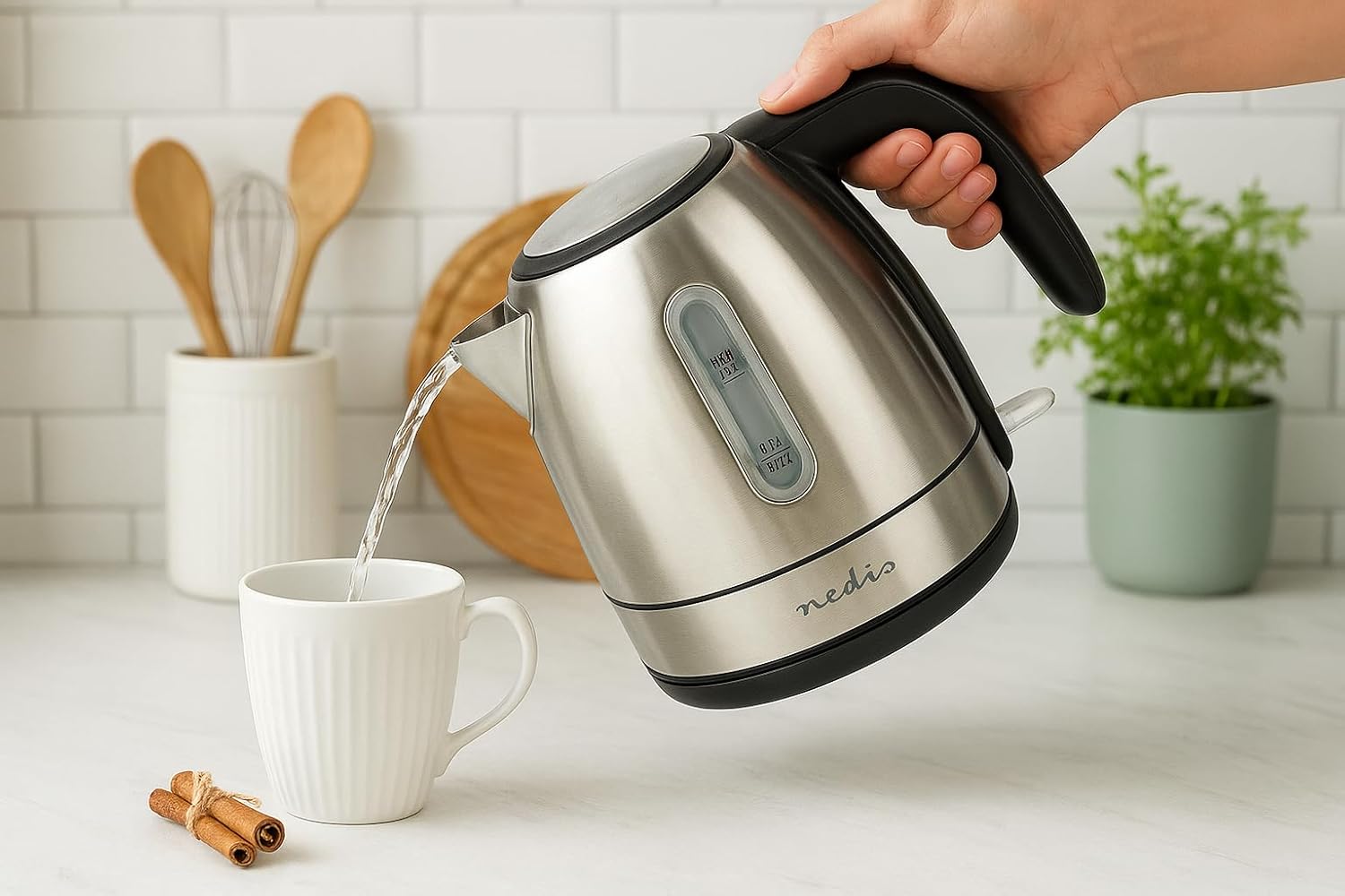 - Der elektrische Wasserkocher von Nedis bereitet mit einem Fassungsvolumen von 1 Liter schnell und leise Wasser für Kaffee oder Tee zu / Der Sicherheitsdeckel wird durch einfaches Drücken geöffnet