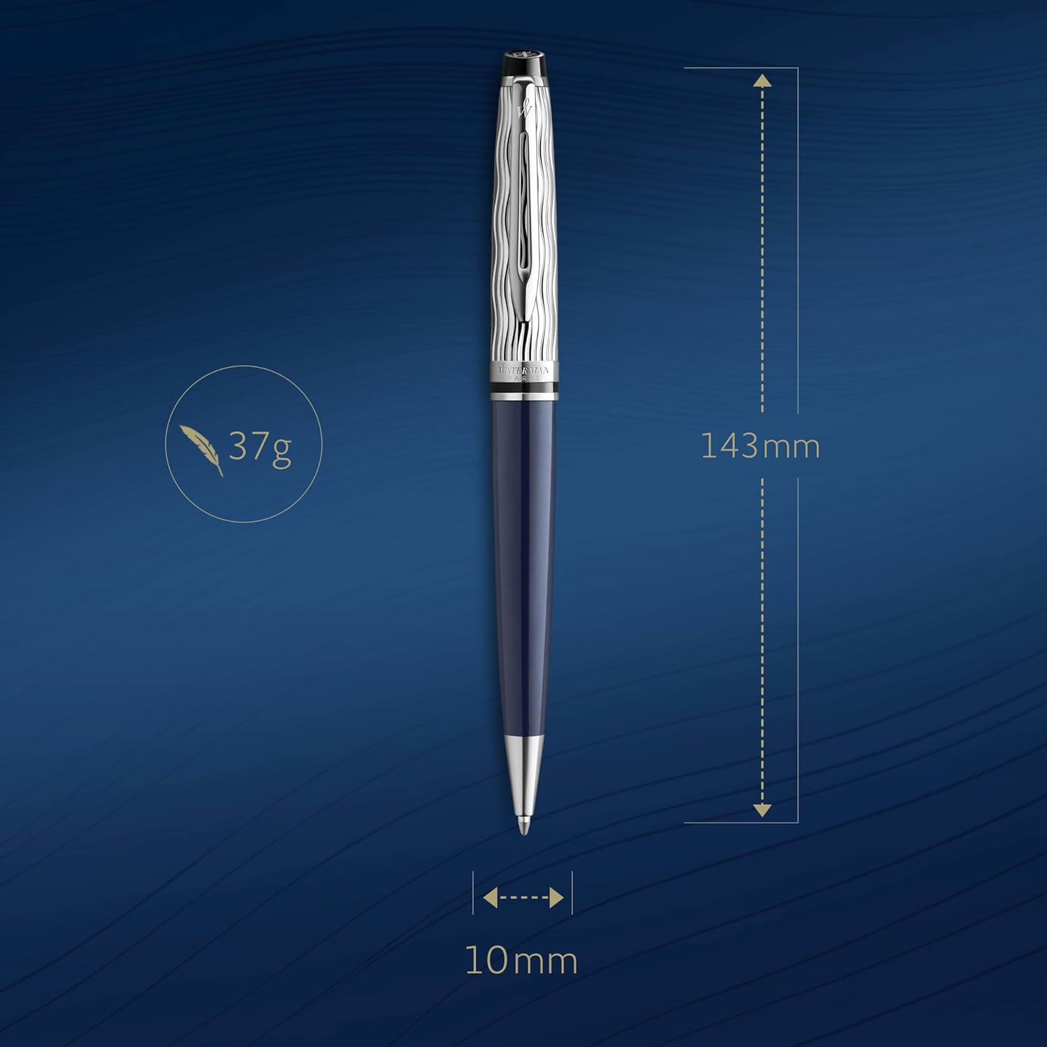 - L’Essence du Bleu: Schaft in tiefblauer Lackierung, für die Waterman weltbekannt ist, charakteristisches Wellenmuster als Ziselierung auf der Kappe und Palladium-plattierte Kappe und Zierteile, die für ein hochwertiges Finish sorgen