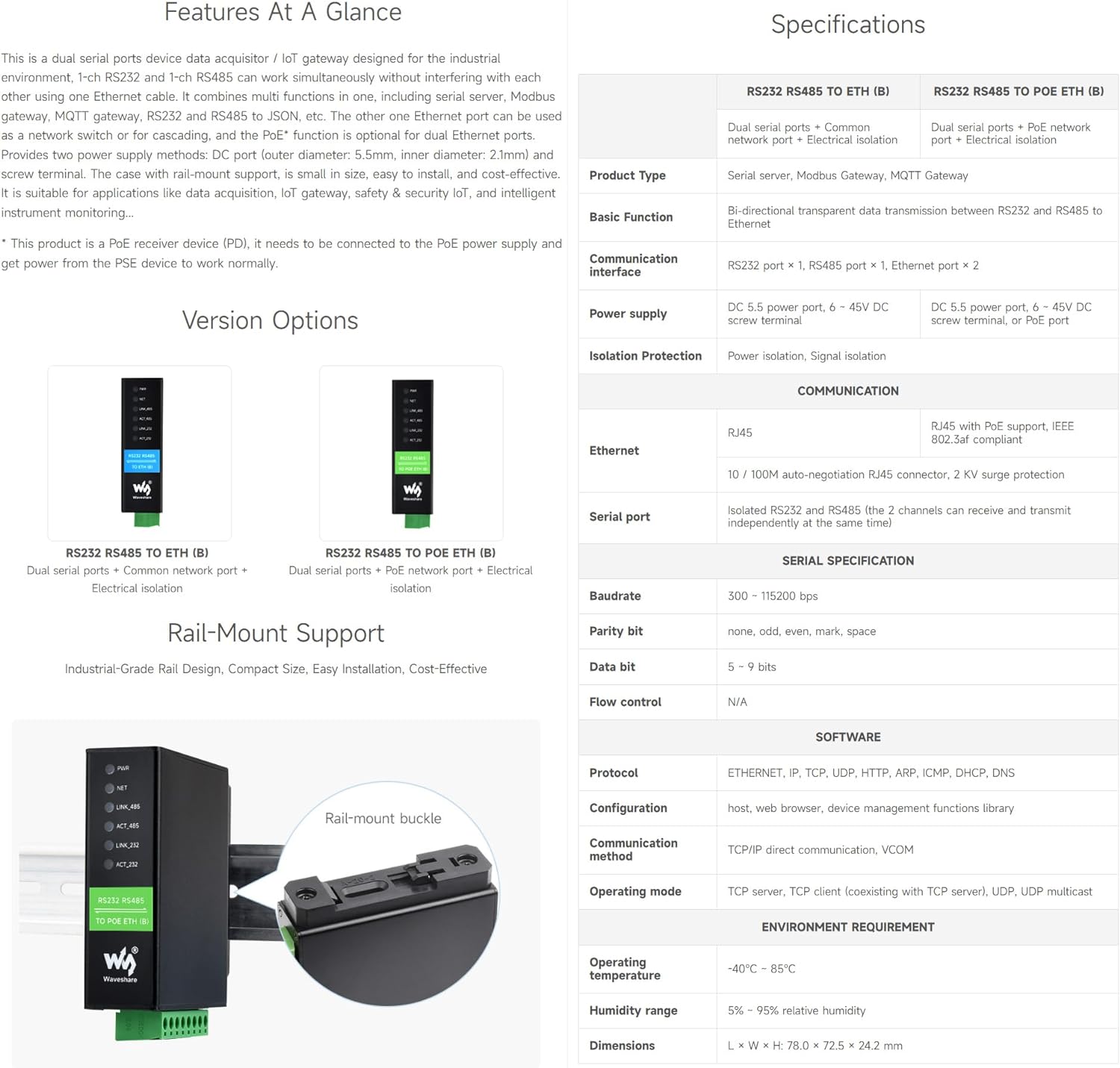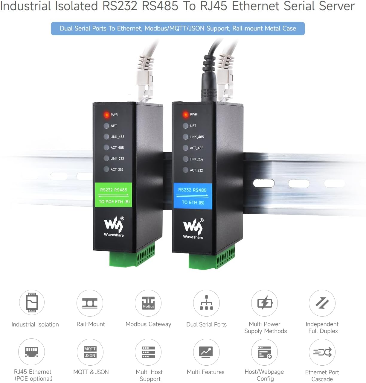 Waveshare RS232 RS485 to RJ45 Ethernet Serial Server Dual Channels Independent Operation Dual Ethern