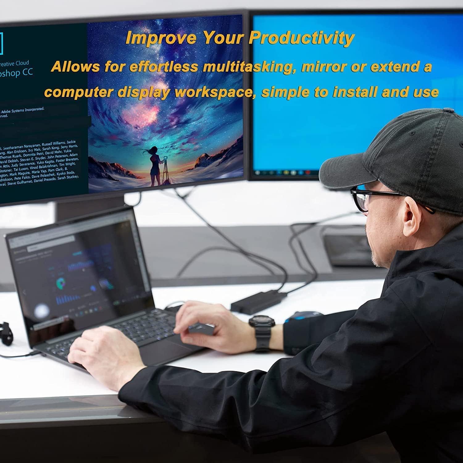 - Dual Display – USB-zu-HDMI-Adapter fügt Unterstützung für zwei HDMI-Monitore hinzu, die jeweils eine erweiterte oder gespiegelte Anzeige mit Auflösungen von bis zu 1920 x 1080 bei 60 Hz ermöglichen – alles über eine einzige Verbindung zurück