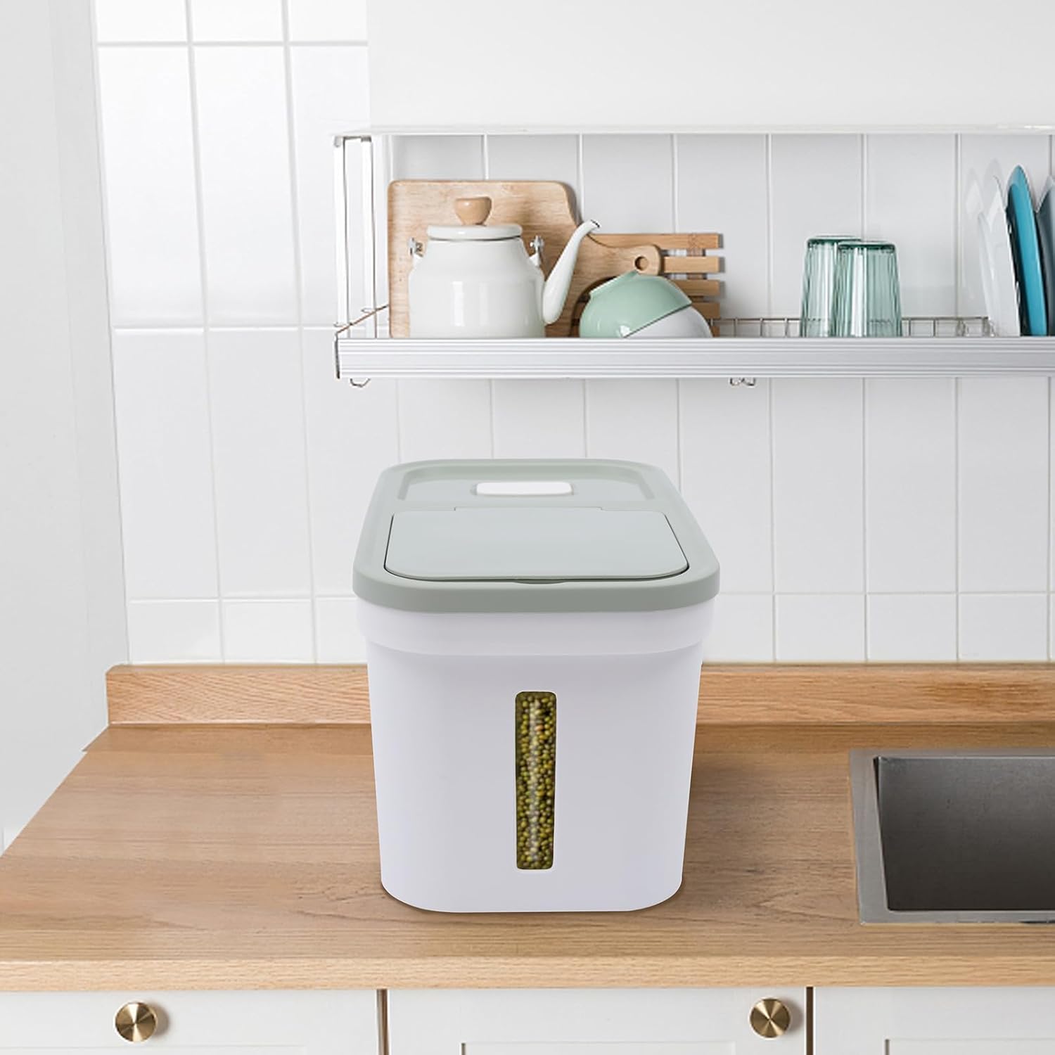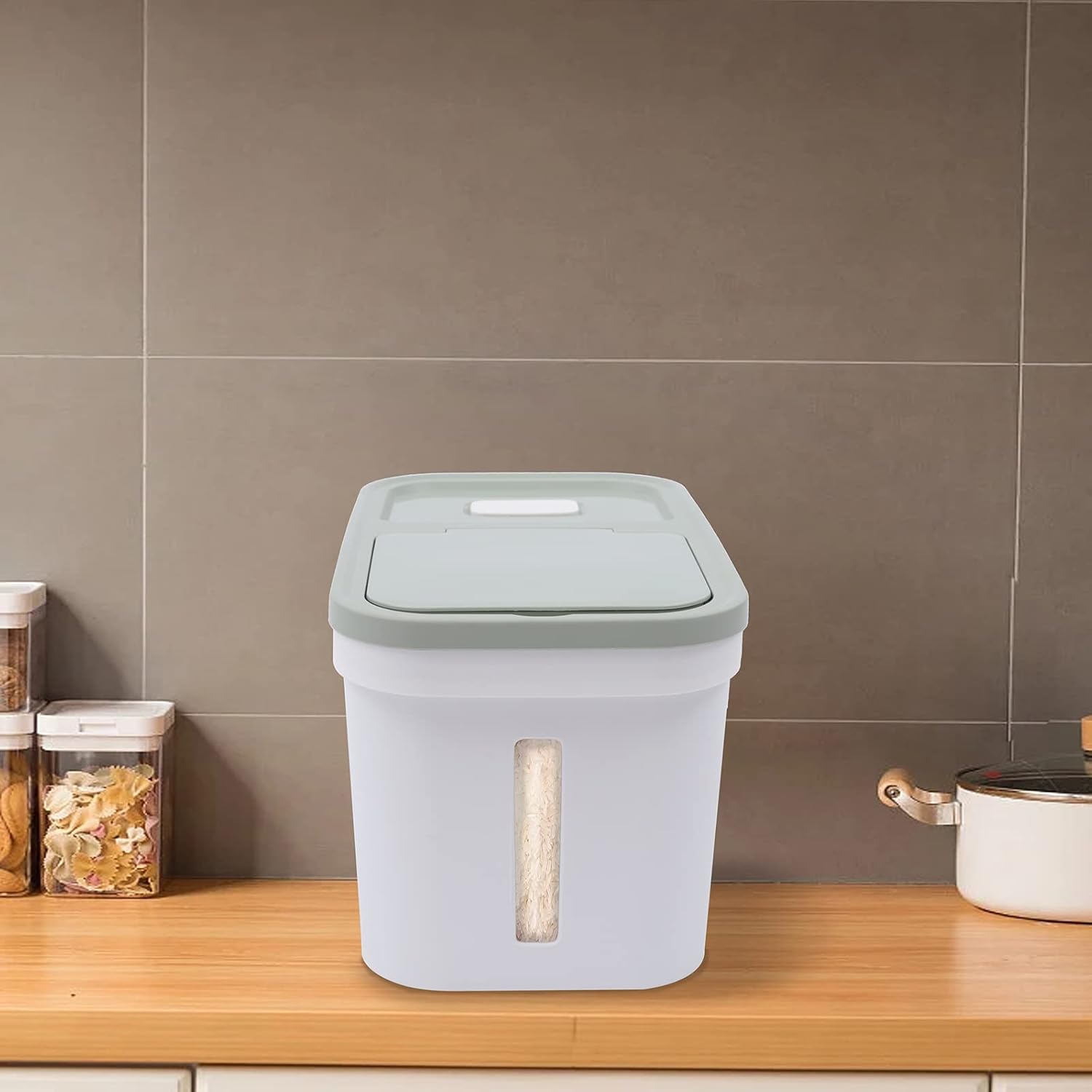 - Visuelles Fenster-Design: Es gibt ein klares Fenster mit einer klaren Skala Linie auf dem Behälter, so dass Sie direkt sehen können, die Art von Getreide in den Behälter und die verbleibende Menge, ohne den Deckel zu öffnen, die bequem für Sie in