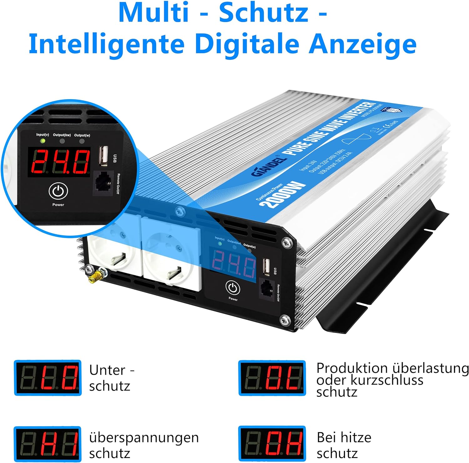 - LED-Anzeige: einfach zu sehen, die Eingangsspannung und Ausgangsleistung und Wechselrichterschutz-Funktionscode. Fernbedienung: kabel 4.5 meter, bequem, um den Wechselrichter aus der Ferne ein-/ aus; Diese Fernbedienung sie können aus grosser Entfernung