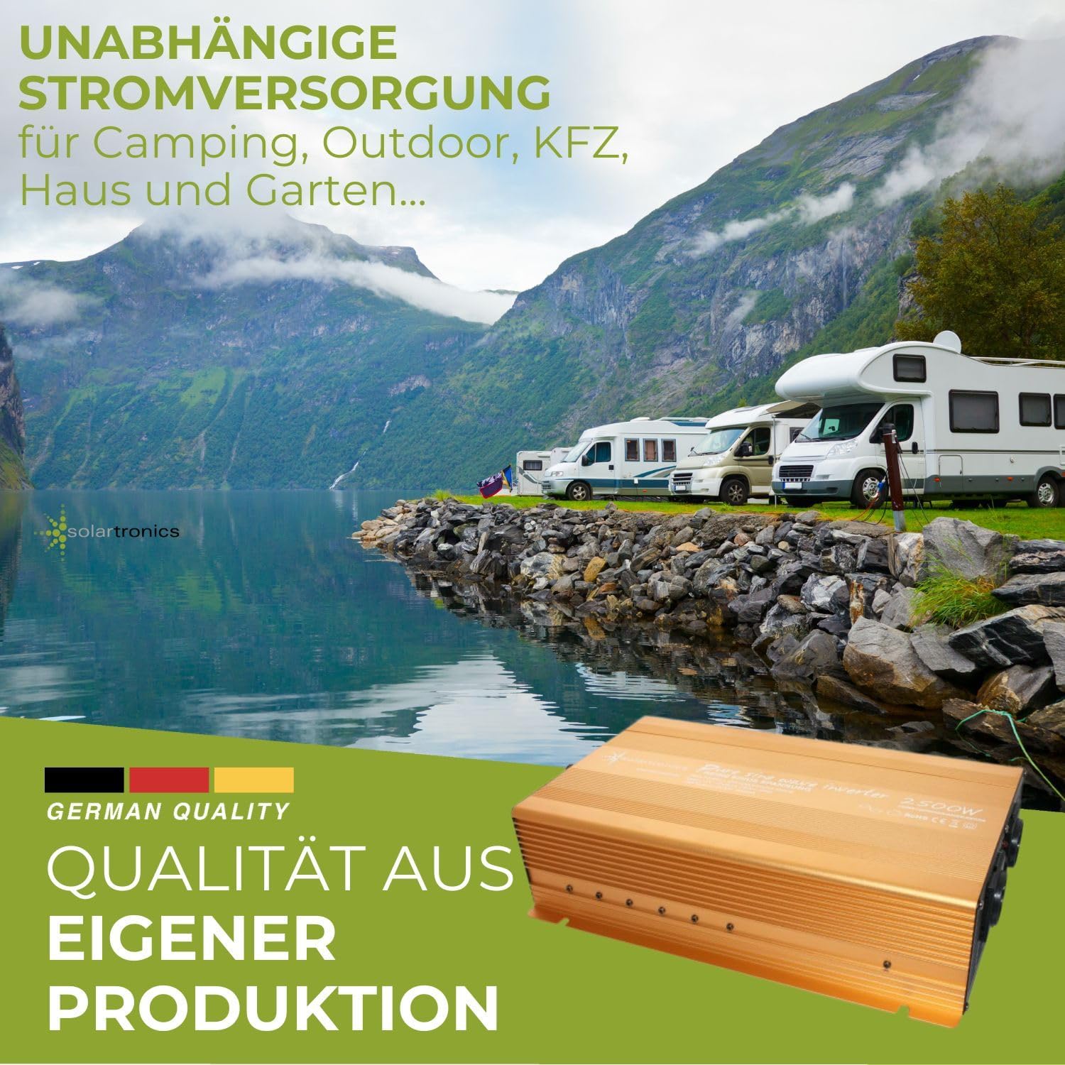 - HOCHWERTIGE KOMPONENTEN - Der Solartronics Sinus Spannungswandler – Inverter ist sehr robust gebaut. Das Gehäuse besteht aus Aluminium und Formblech. Alle unsere Spannungswandler und Laderegler produzieren wir selbst mit strengen