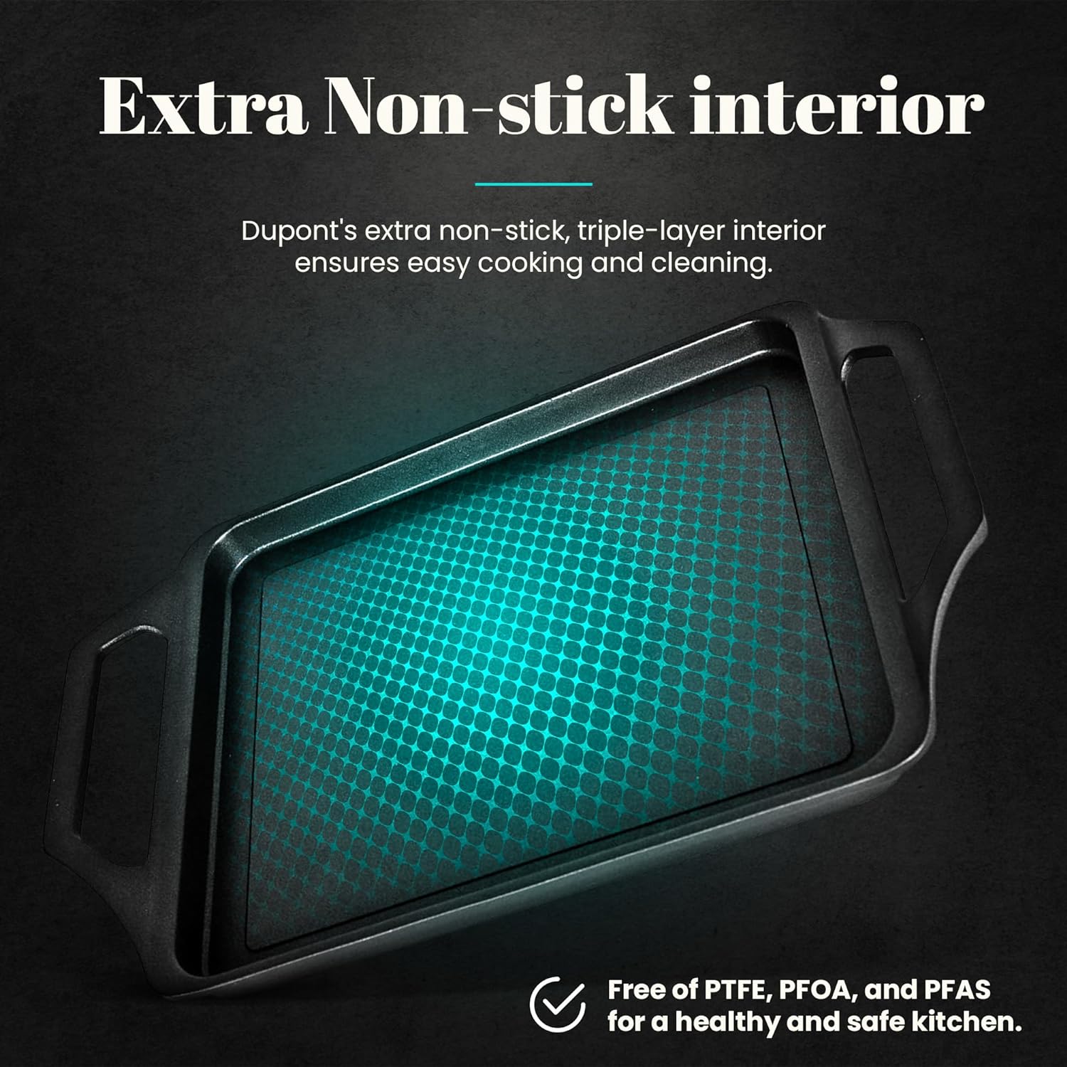 - 【INDUKTION】 Die Griddle-Pfanne hat einen rechteckigen Induktionsboden mit einer 5 mm dicken Oberfläche, die eine perfekte und gleichmässige Wärmeübertragung über die gesamte Fläche ermöglicht und so Energie spart.