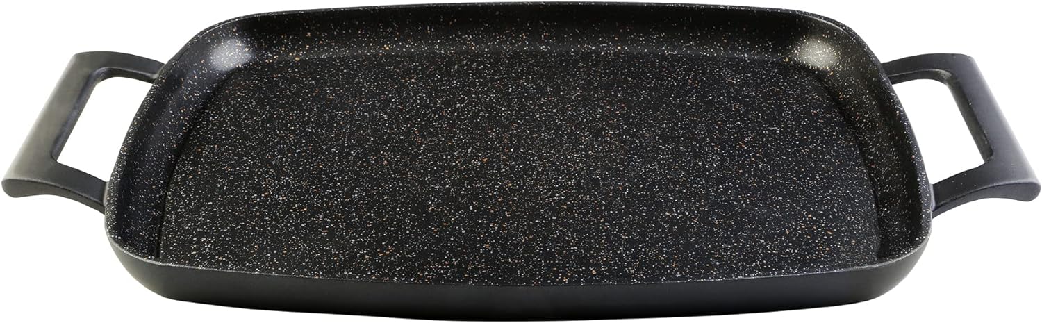 - Abnehmbare Silikongriffe: Mit 2 isolierten Silikongriffen, damit Sie die Grillplatte sicher bedienen können, ohne Angst vor Verbrennungen. Masse: 47 x 30 cm.