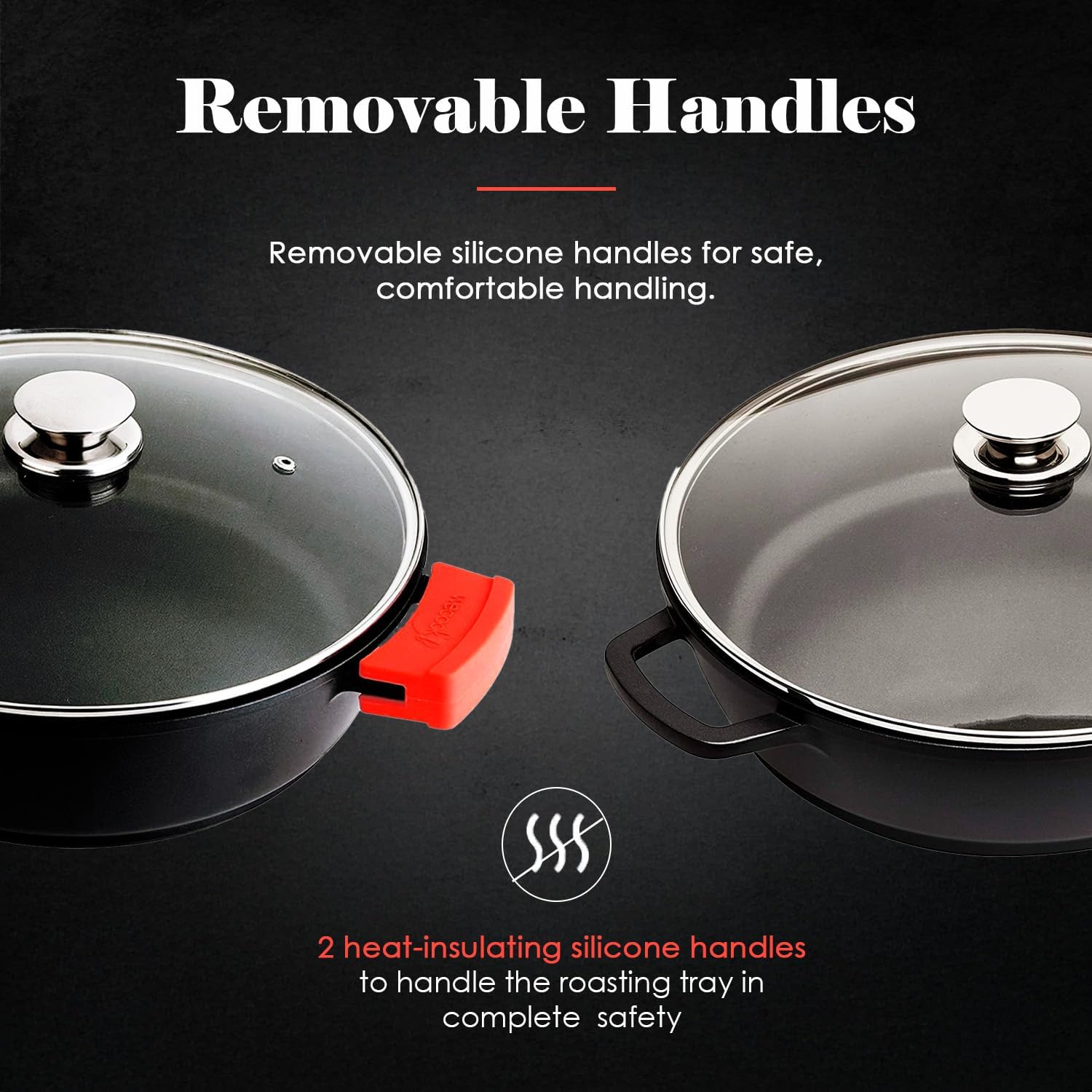 - 【DECKEL AUS GEHÄRTETEM GLAS】 Einschliesslich Deckel aus gehärtetem Glas mit Dampfauslassventil und Edelstahlknopf. Mit abnehmbaren, thermoisolierenden Silikongriffen. Leicht zu pflegen, spülmaschinenfest.